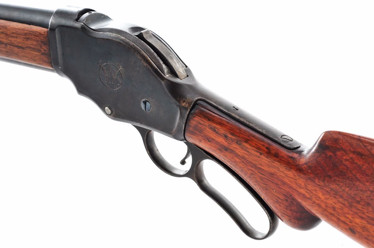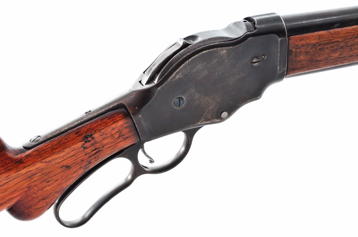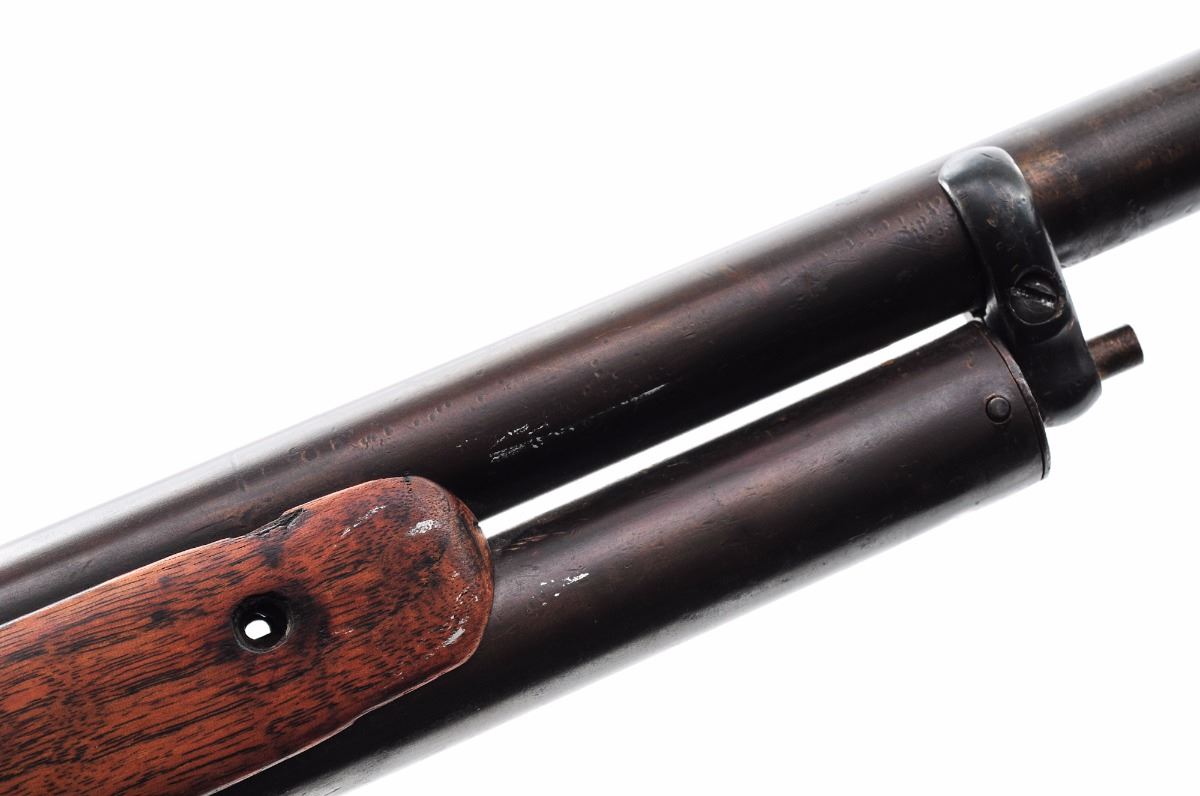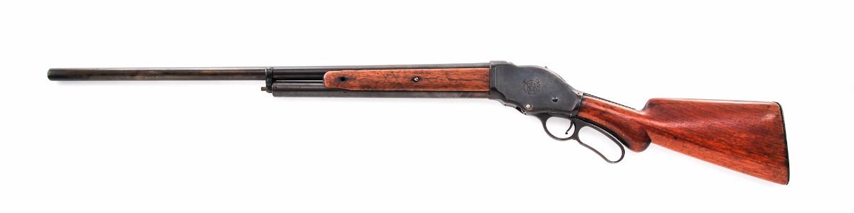 Winchester Model 1887 Lever Action Shotgun, #34757, 12 ga., 30'' barrel, blue finish, three-piece walnut stock. No sights. Condition is good retaining approx. 20% blue finish, the rest turning to a smooth brown, with light surface oxidation and some pitting near lever pivot screw. Stock is sound as heavily sanded and refinished, with one crack near left side receiver tang. Forward forearm screw is missing with losses on both sides near screw hole. Checkered steel buttplate is in good condition. Action is tight, magazine has been welded to the receiver, bore is rough. Examination by a qualified gunsmith is highly recommended before firing. Est.: $400-$600. (Antique)
