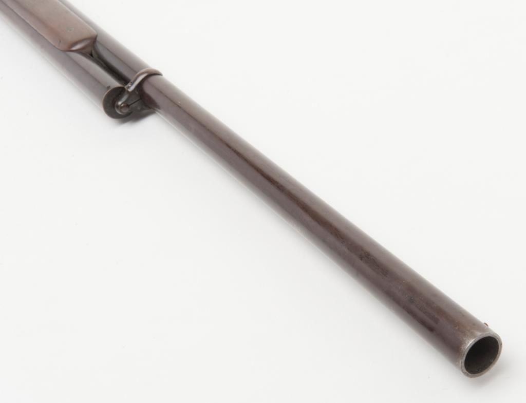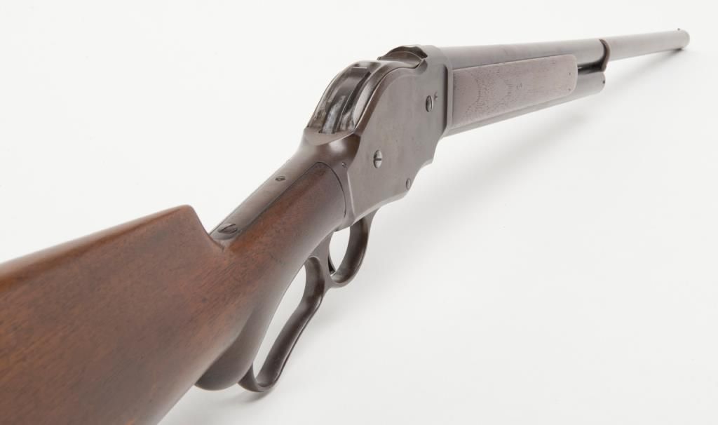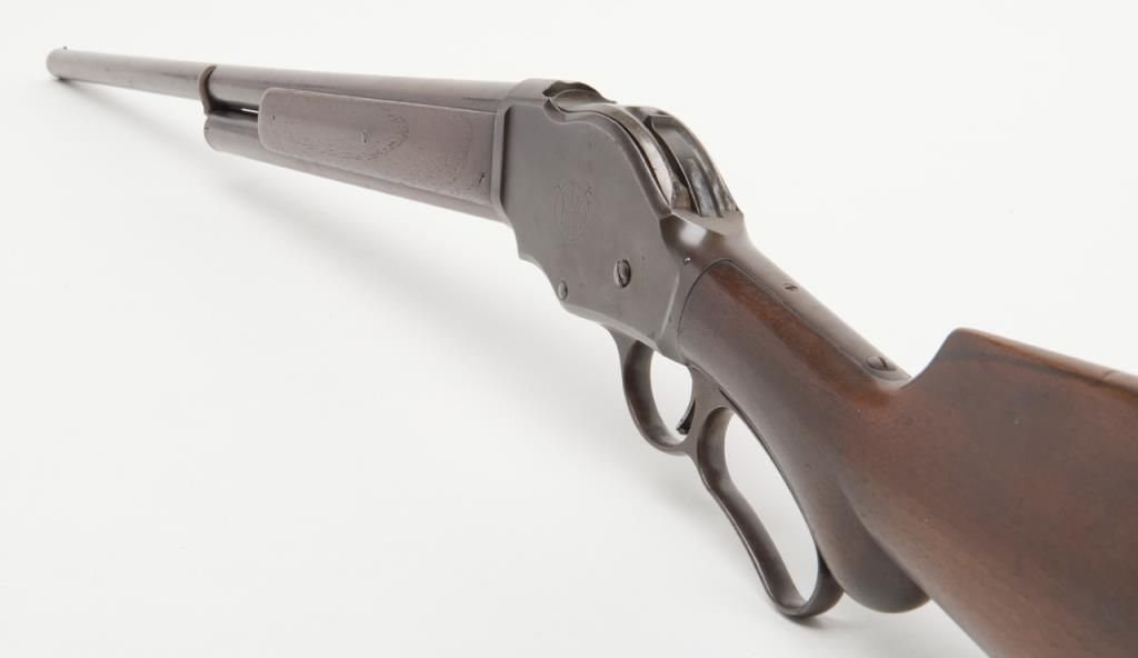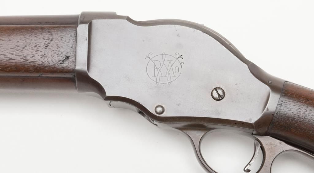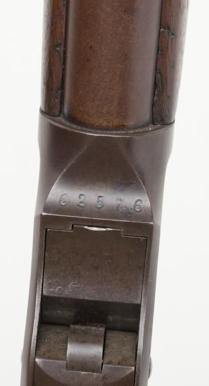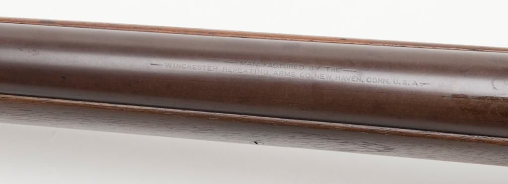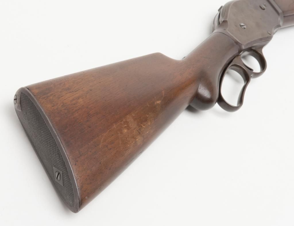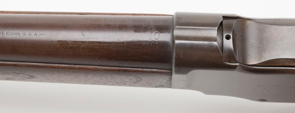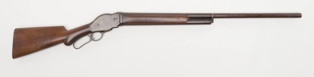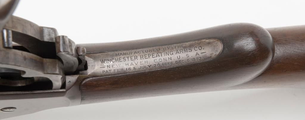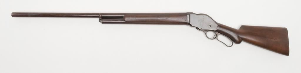 Winchester Model 1887 lever action shotgun, cal. 10 gauge, Serial #62576. The shotgun is in overall very good condition with a 32” blued barrel. The barrel and magazine have gone almost entirely to a pleasing plum patina with a brassbead front sight. The receiver is patina as well with some minor surface erosion. The smooth wood stocks are in very good condition with minor mars and compressions consistent with use, ending in a checkered steel butt plate. The bore is verygood, the action crisp and markings sharp on this fine old shotgun. (Antique) Est. : $1,000-$2,000.