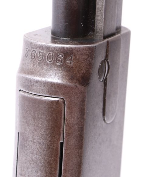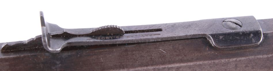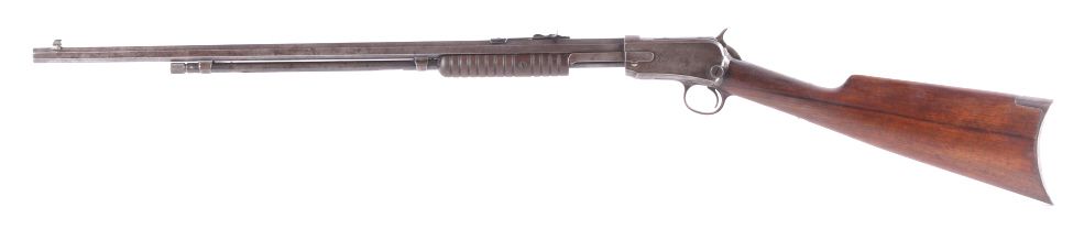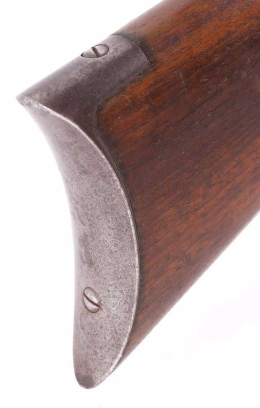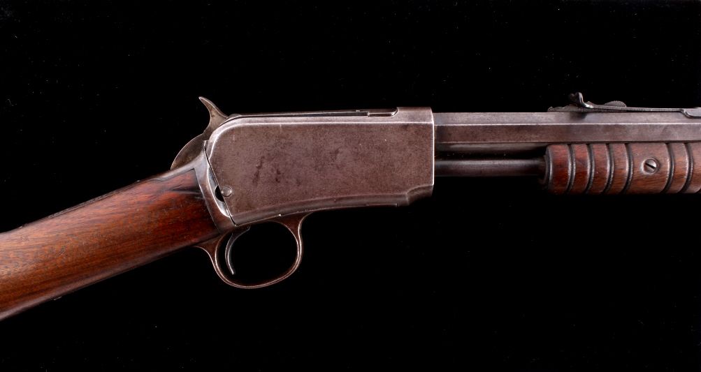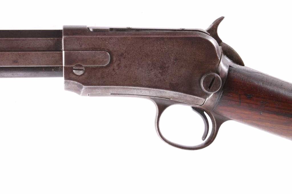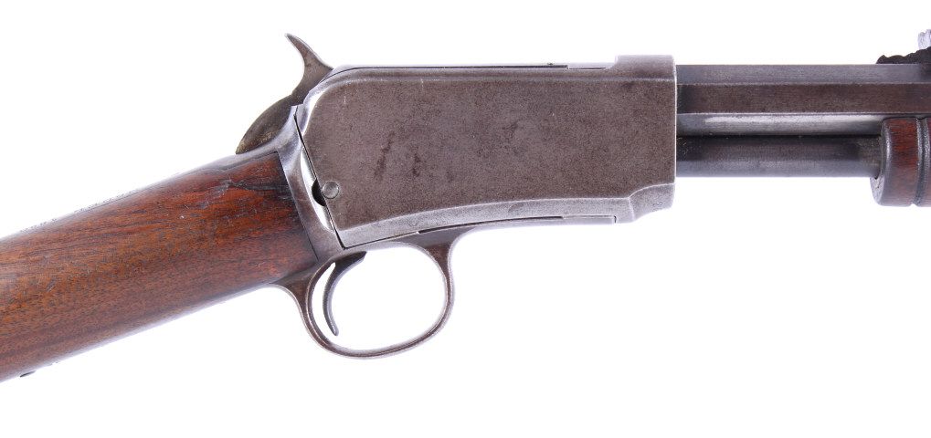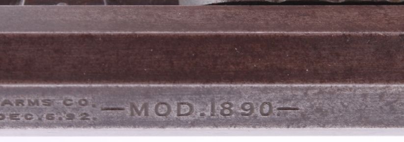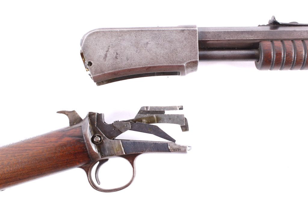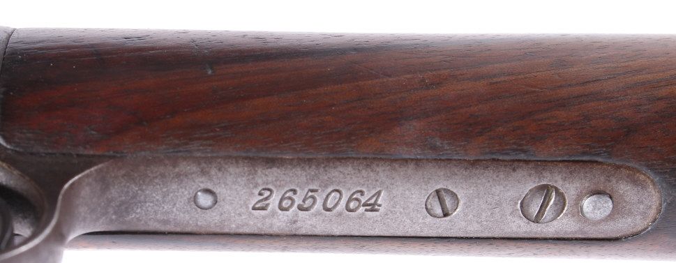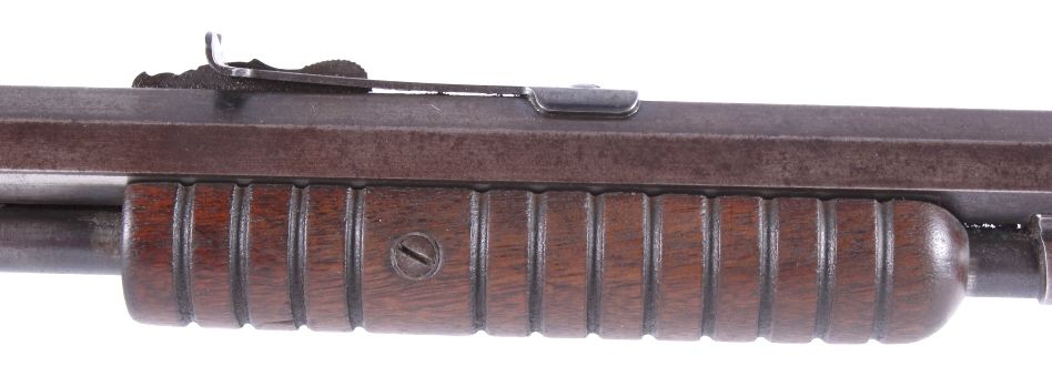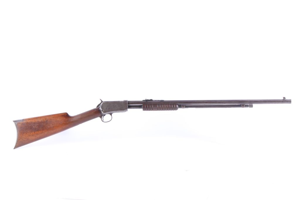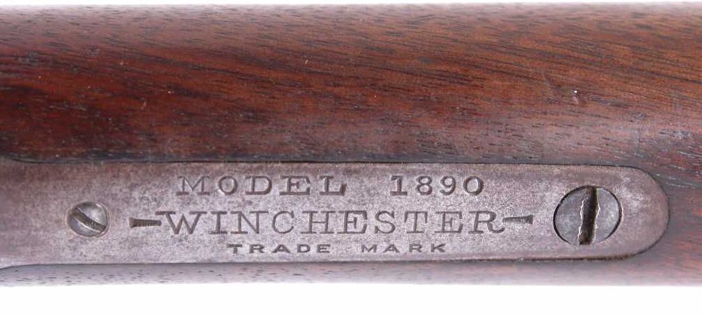 This is a Winchester Repeating Arms Company Model 1890 rifle. The rifle has a .22 Short caliber, octagon barrel, and adjustable sights. The rifle has a serial number of 265064 and was manufactured in 1904. Metal crescent butt plate. This is a Gallery Gun.