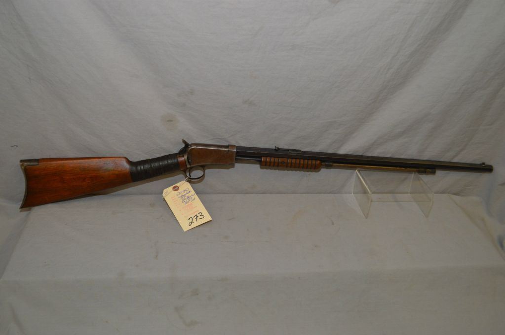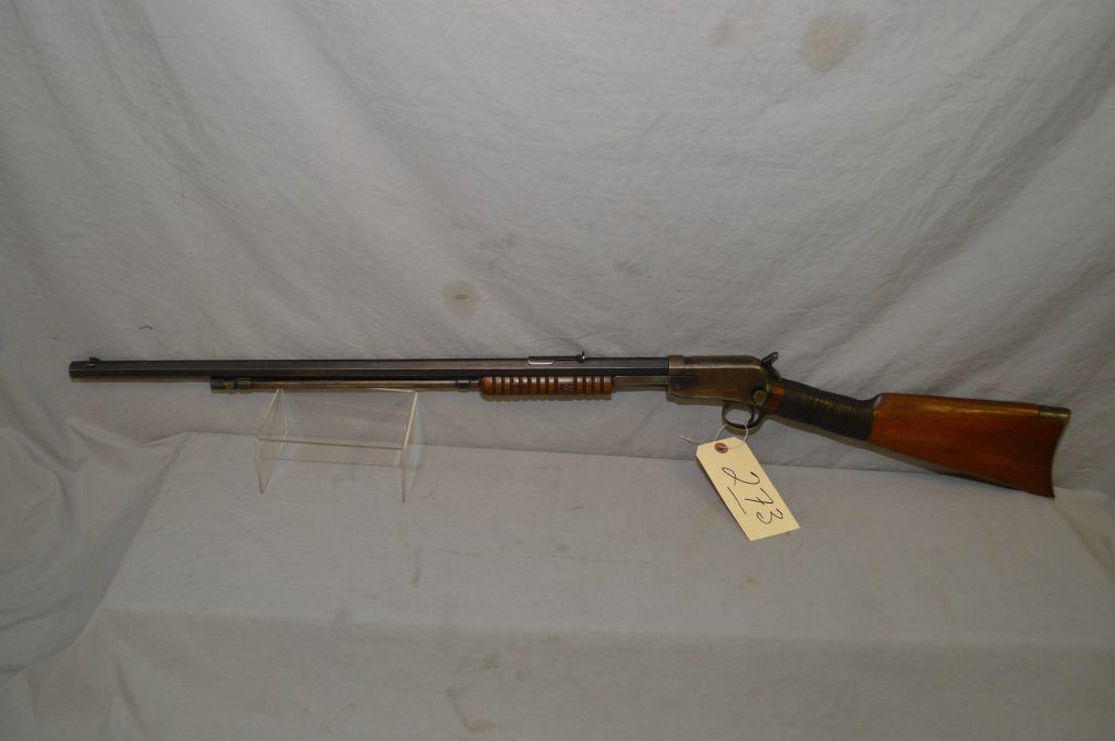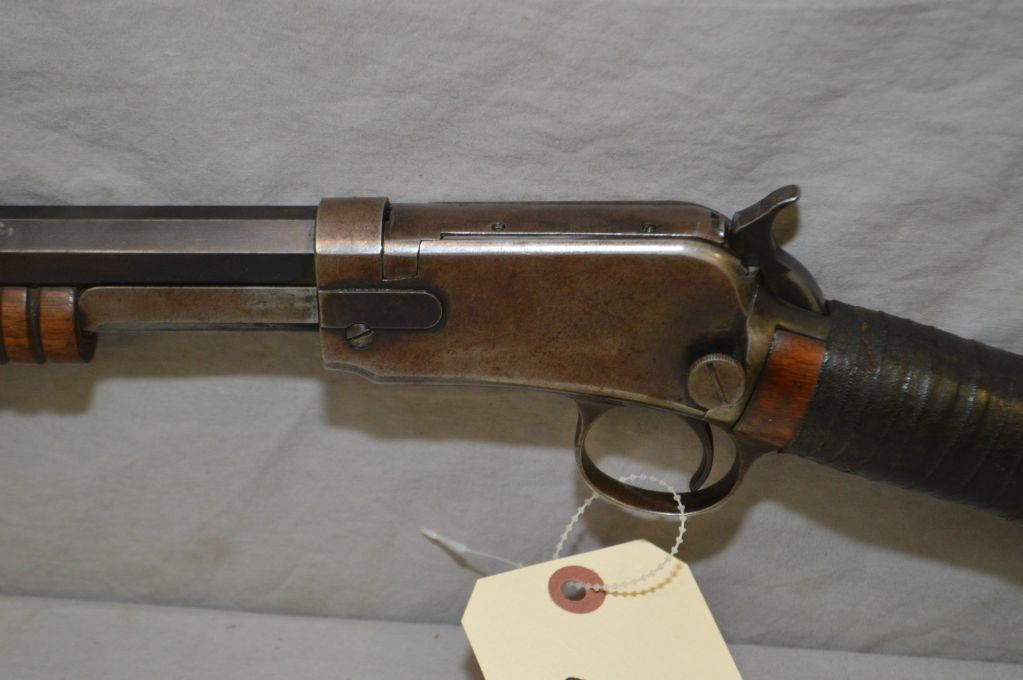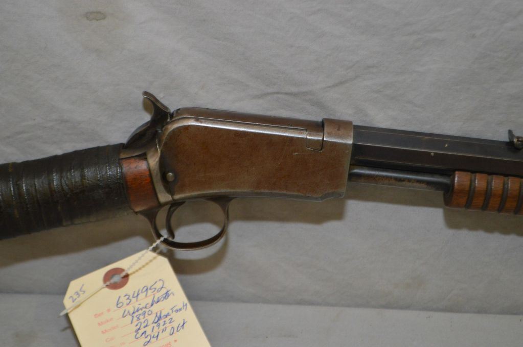 Winchester Model 1890 .22 Short ONLY Cal Tube Fed Pump Action Rifle w/ 24" octagon bbl [ blued finish, starting to fade and turning brown on receiver and carry areas, butt stock taped at wrist, metal crescent butt plate, good forewood, Circa 1922 ] Ser # 634952