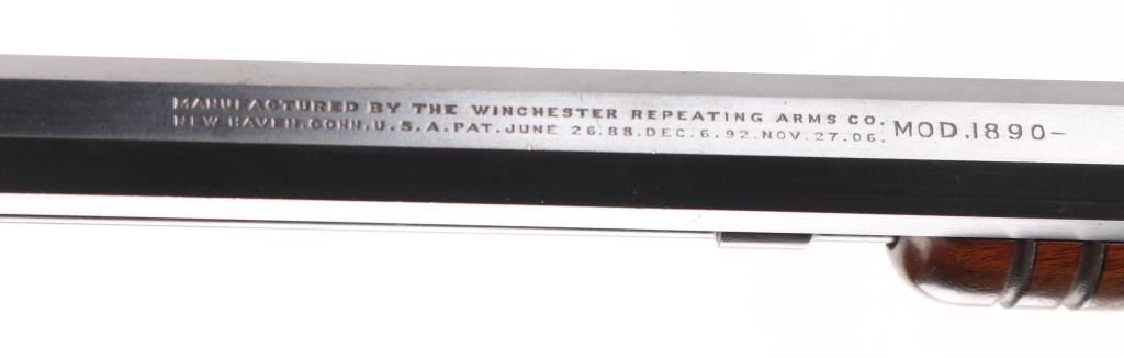 Pump action rimfire rifle manufactured circa 1909. Features blued finish, grooved 'corn cob' wood pump handle and shoulder stock with straight grip area, crescent steel buttplate, 24" octagonal barrel, blade/bead front sight, adjustable rear sight, magazine tube under barrel, external hammer, take down screw in receiver. Bore is good with strong rifling, light pitting. Blue finish is about 65% with handling loss, mostly on the receiver, & tube.. Numbers match on receiver & lower tang. Markings are crisp.. Condition is NRA Good. C&R Firearm.