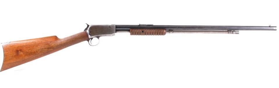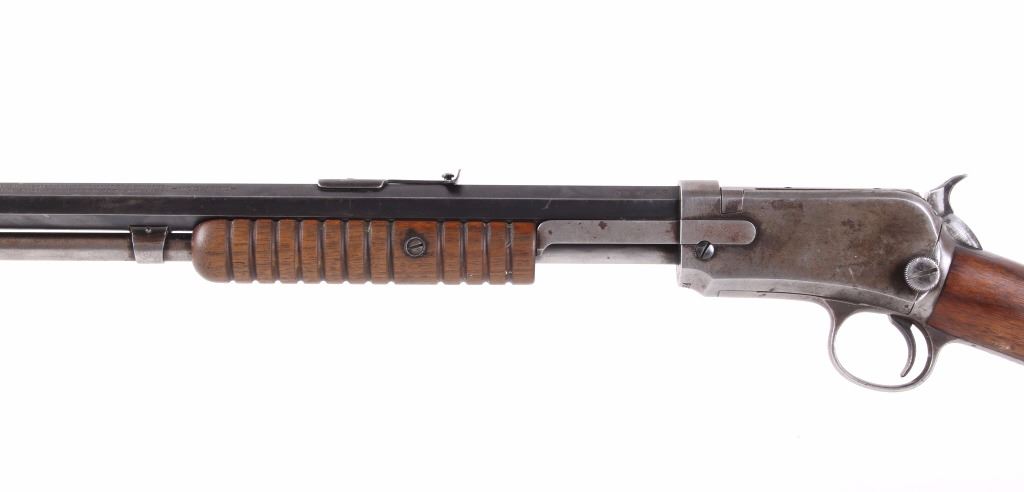 This is a Winchester Model 1890 22 W.R.F pump action rifle. This rifle features a 24" octagon barrel, blued steel finish, and straight walnut stock. The Model 1890 proved to be the most successful repeating rim fire rifle for general all around shooting ever made by Winchester. Approximately 849,000 Model 1890 rifles were produced between 1890 and 1932, after which the Model 1890 was replaced by the Winchester Model 62 rifle. A final cleanup of stock on hand was completed in 1941. The rifle is in good condition, with much of the bluing on the barrel intact while the receiver and magazine shows little left. The stock and forearm show good condition with slight handling wear. This rifle was manufactured in 1919 with a total of 27363 being produced that year. Curio & Relic rifle. FFL transfer or NICS background check. Serial number is 604564. Overall length is 40 1/2"
