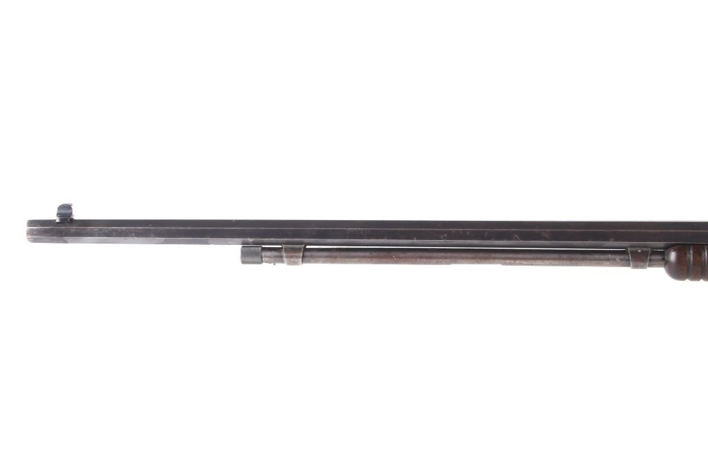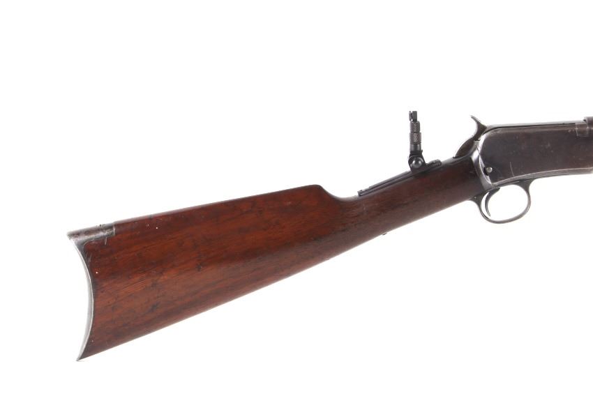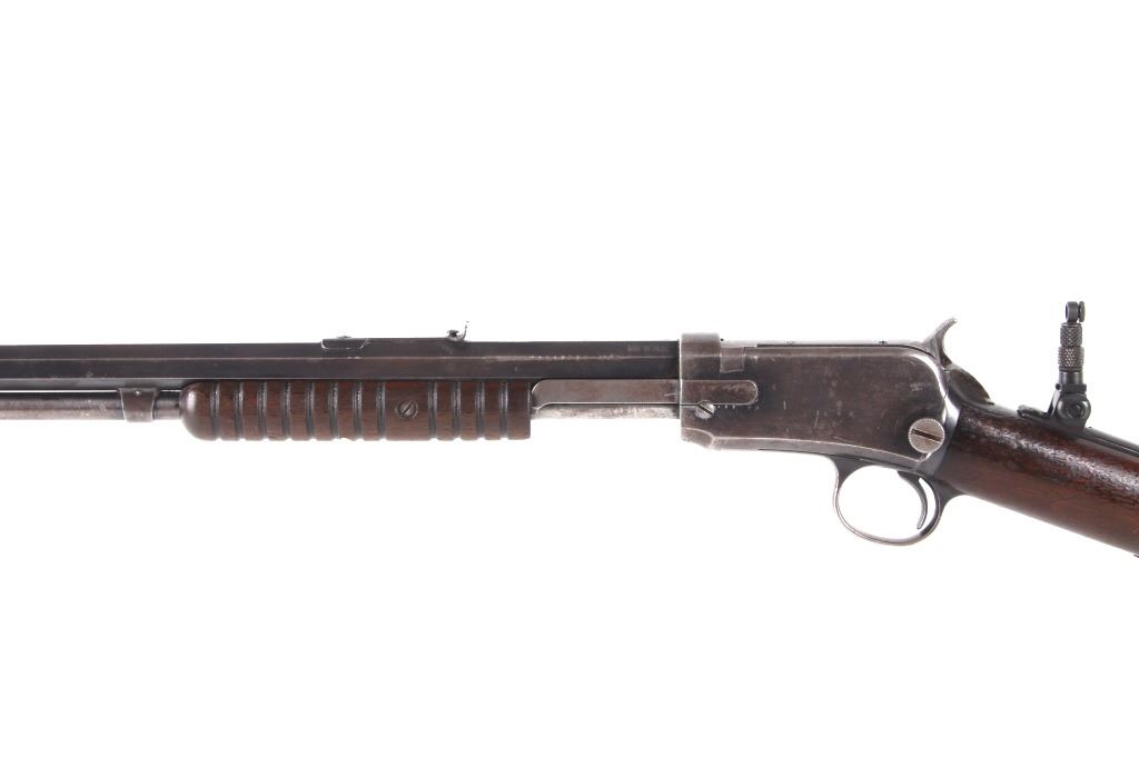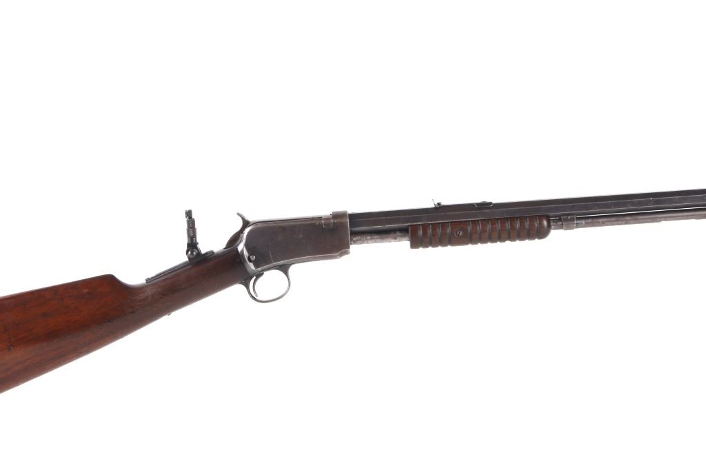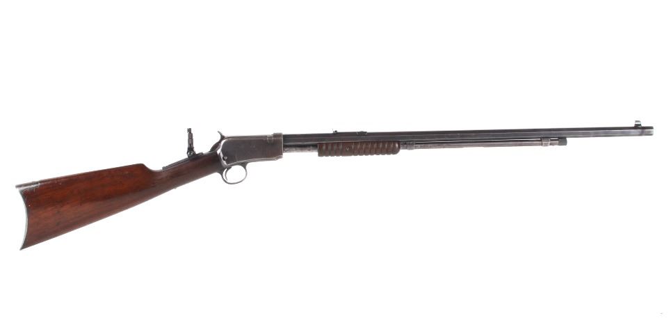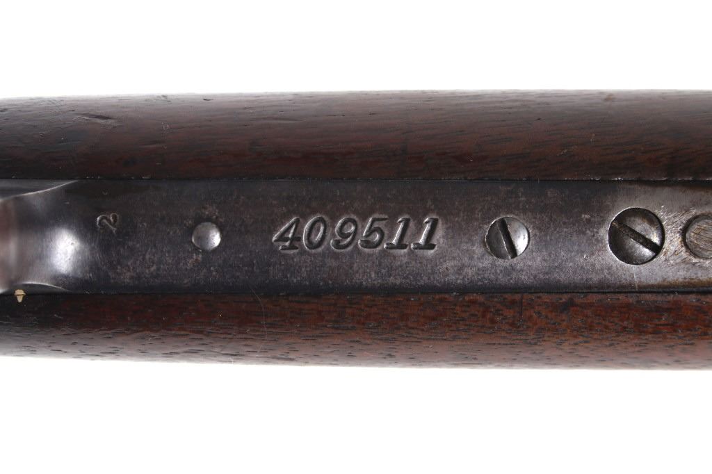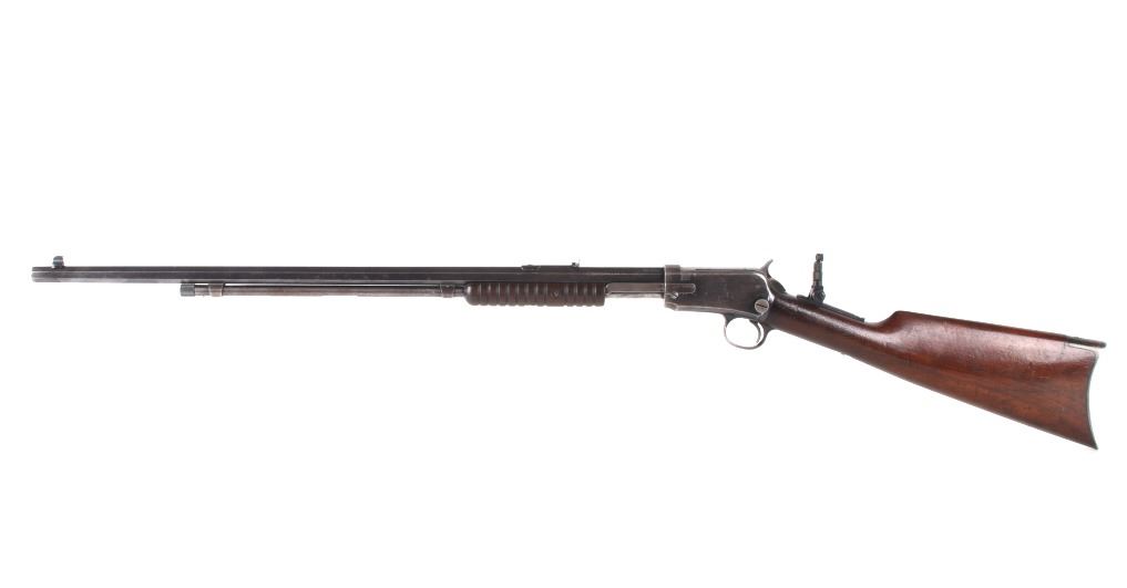 Featured in this lot we have an early Winchester Model 1890 pump action rifle in .22 W.R.F. caliber, serial number 409511, manufactured in 1909. The rifle features a .22 W.R.F. chambering along with its standard 24" long barrel, walnut stock, and distinctive slide action. All Winchester markings and patent dates on the barrel are sharp and distinct as is the “MODEL 1890” stamping. The barrel ahead of the receiver is clearly marked “22 W.R.F.” and the upper tang retains good Winchester markings. This rifle also retains the original buckhorn rear sight with an aperture tang sight.The front sight is the correct short blade with bead. The action is tight and the forend is excellent. The forend screws are also in excellent condition . The butt stock is an uncleaned dark reddish/brown walnut that Winchester was known for. The takedown fit between the receiver and barrel assembly is also tight with no play and the bore retains good rifling. The Model 1890 was one of the most iconic and successful of all 20th Century .22 Rim Fire rifles. Most saw hard use in target shooting, small game hunting and general plinking. Very few have survived in presentable condition today. This is an outstandingly 115 year old Winchester. The rifle weighs 5lbs 10oz. Serial Number: 409511. This firearm qualifies as a Curio & Relic firearm, and requires FFL Transfer or NICS Background Check.