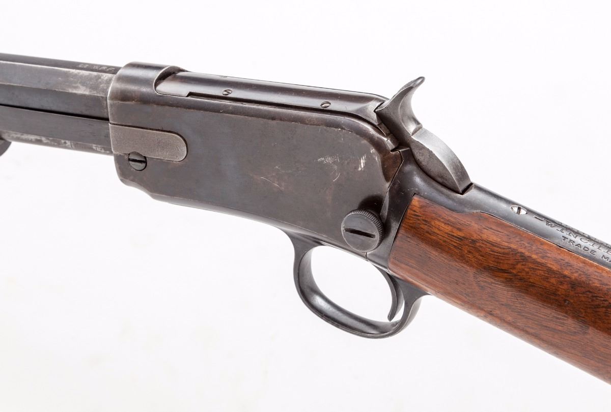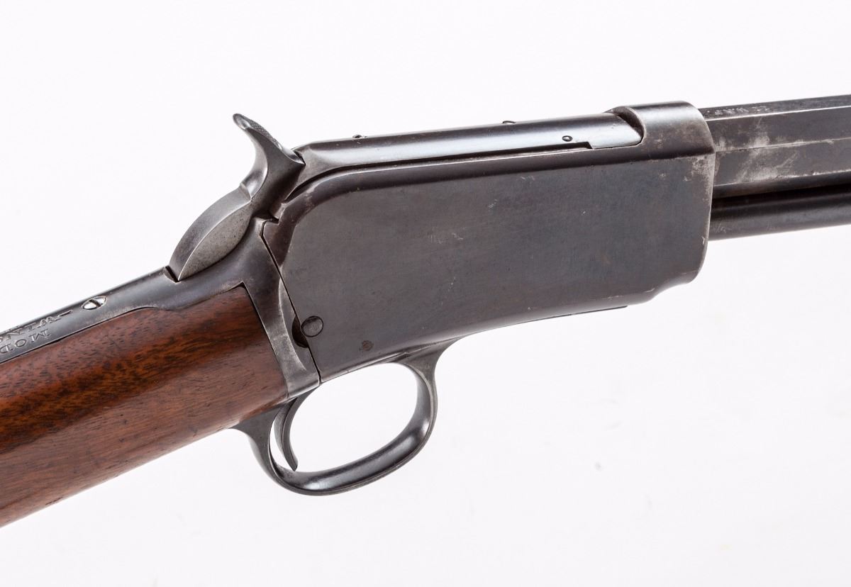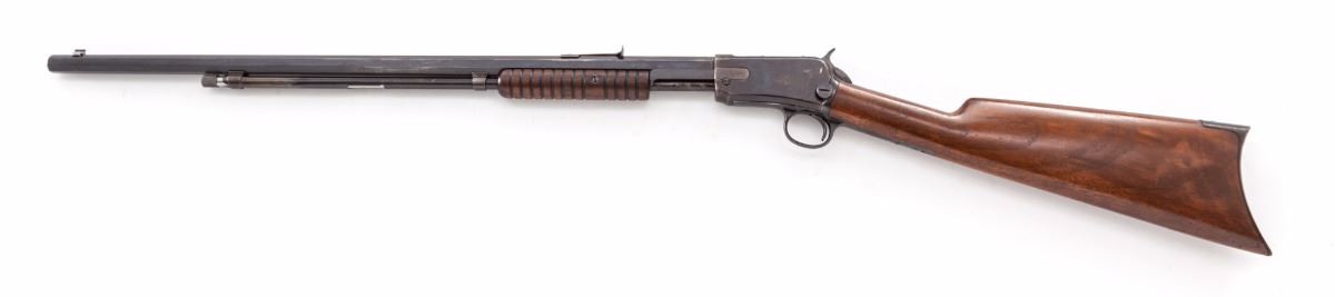Winchester Model 1890 Pump Action Rifle, #260847, .22 WRF cal., 24'' octagonal barrel, blue finish, walnut stock and forend. Mfg'd 1906. Condition is very good retaining approx. 75%-80% blue with some touchup to frame. Stock has been refinished at one point showing light sanding, additional stain and varnish; forend is untouched. Good action and bore. Est.: $450-$650. (C&R)