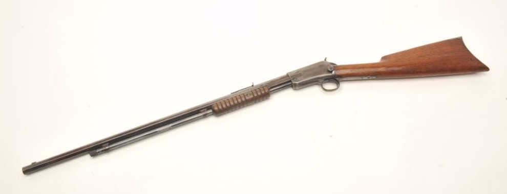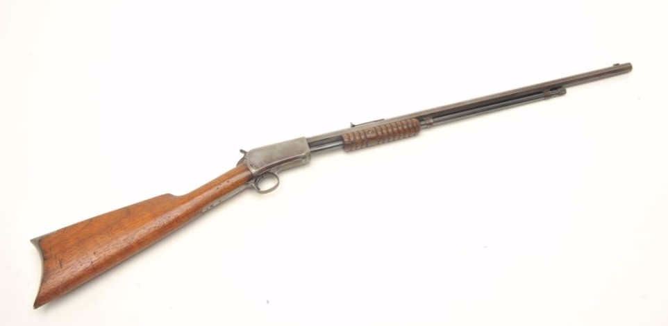 Winchester Model 1890 Takedown pump rifle, .22 Short caliber, serial #186756. The rifle is in good overall condition with a 24” octagon barrel with a post front and standard rear sight. The barrel and magazine retaina significant amount of their thinning blued finish with sharp edges and some light surface rust noted. The receiver has gone primarily to grey patina with small amounts of blue still visible in the protected areas. The smooth wood stocks are in good condition with small mars and compressions consistent with use. The butt stock ends with a smooth, metal crescent butt plate. The bore is good, action crisp and markingsare sharp. Est.: $700-$900. (C+R).