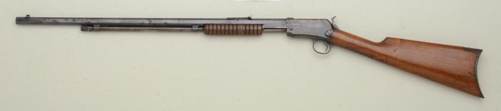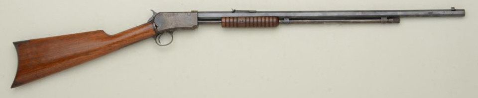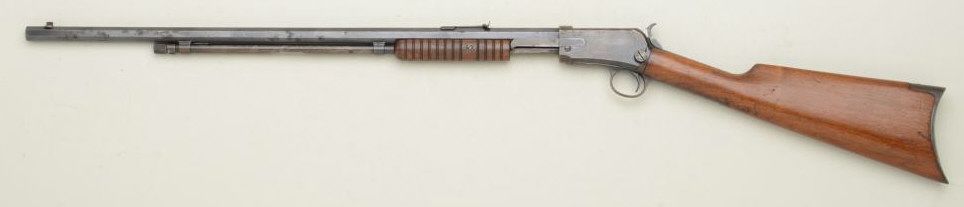 Winchester Model 1890 pump action magazine fed repeater, .22 WRF cal., standard length octagon barrel, in good to very good condition, serial #462896. The rifle retains 50-70% original blue, mostly drifted fromthe frame and magazine tube, and still strong on the barrel. Some erosion and pinprick pitting where the finish has lifted. The stocks are very good+ with just some minor scratches and about 80% varnish on the buttstock. The forend shows even loss of varnish and slight use. The action is good, the interior is very good and the bore is bright and fine to near excellent. From the estate of Johnny Woodard. Est.: $500-$1,000