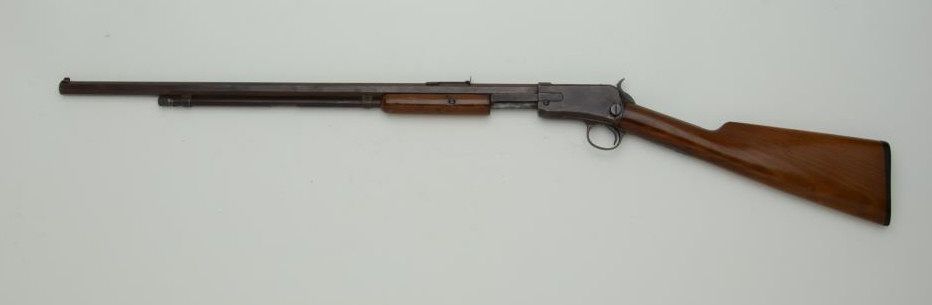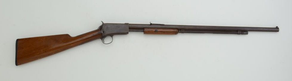 Winchester Model 1890 pump action rifle, .22 WRF cal., #204430, barrel shorted slightly, stock refinished, fair to good overall. Est.: $175-$350.