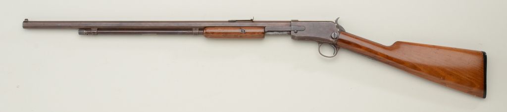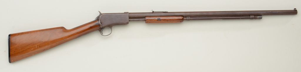 Winchester Model 1890 pump action rifle, .22W.R.F. cal., barrel slightly reduced from 24” to 23-1/2”, brown finish, refinished wood stocks that appear to be from a Winchester Model 1906 pump rifle, #204430. This gun isin overall fair to good condition showing scattered pin prick pitting under an old re-brown finish, good action, worn bore, overall good wood that shows considerable re-finish remaining; old crack on right sideof fore stock. Est.: $250-$350.