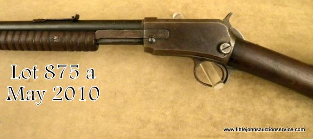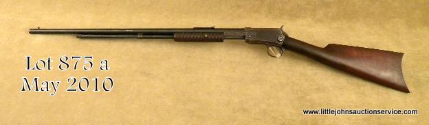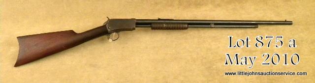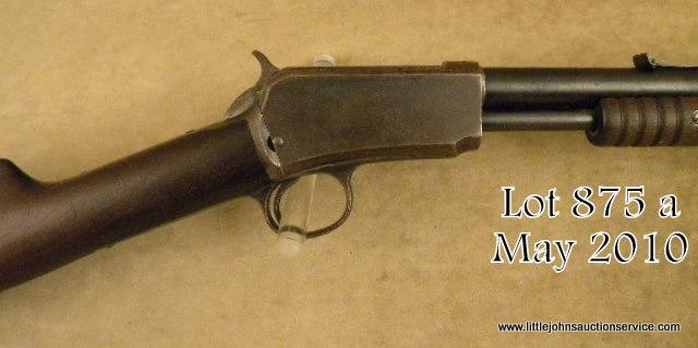 Winchester Model 1890 pump rifle, re-barreled with a Winchester Model 61 barrel, .22WRF cal., 24” barrel, blue finish, wood stocks, #142881.This gun is in overall good condition showing considerable original blue on the barrel assembly and a browpatina on the frame with some dings and scratches from use and storage; the bore is very good, the action crisp, the markings good and the wood stocks overall good with some scratches to the butt stock from storage. Est.: $200-$300.