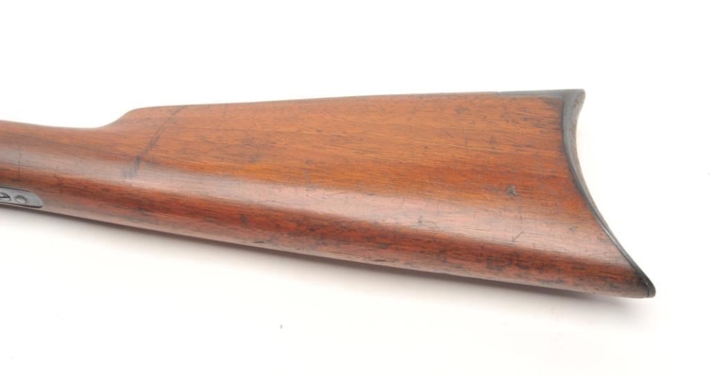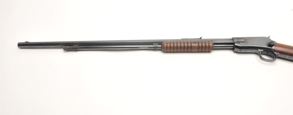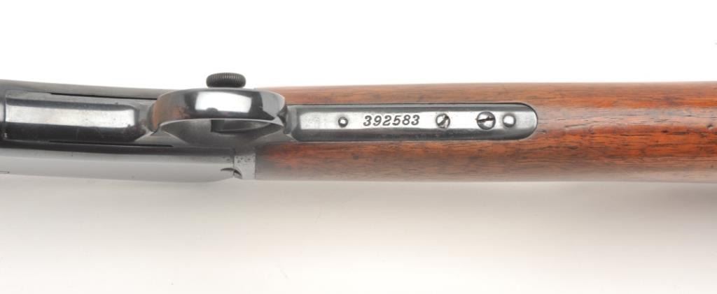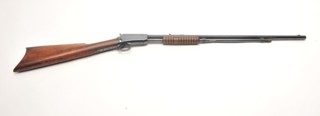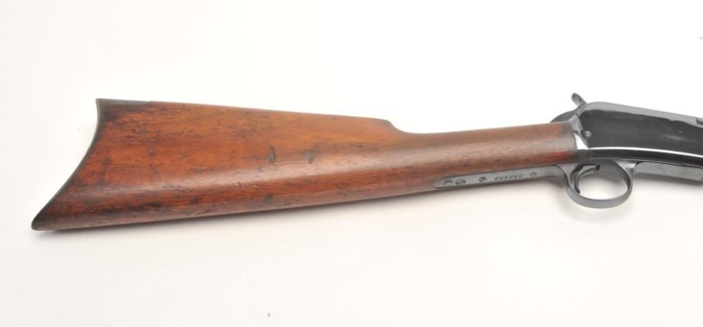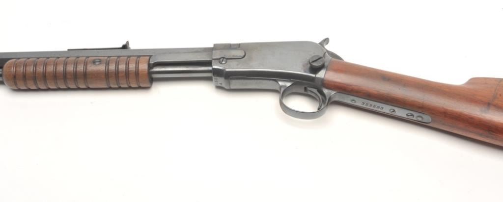 Winchester Model 1890 takedown pump rifle, .22 Short caliber, serial #392583. The rifle is in good overall condition as re-finished with a 24” octagon barrel. The barrel, magazine and receiver retain a significantamount of an old, quality re-blue with some light to moderate surface rust noted at the muzzle. The smooth wood stocks are in good condition with small mars and compressions consistent with use. The butt stock endswith a smooth crescent butt plate showing moderate surface rust from poor storage. The bore is rough and may clean, the action crisp and markings are legible. (C+R) Est.: $200-$400.