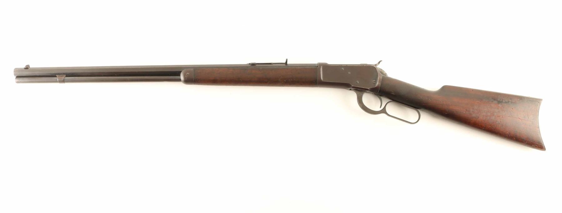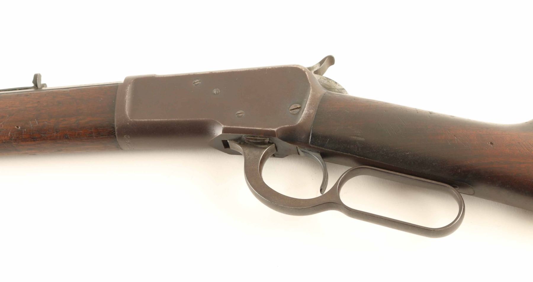 Lever action rifle manufactured circa 1912. Features 24" octagon barrel, buckhorn sights, full length magazine tube under barrel, steel crescent buttplate. Bore is fair condition, frosted, slightly dark & pitted, visible leading or fouling needs cleaning, strong rifling. Metal surfaces show an even dark brown aged patina with slight roughness in places, bare metal showing on sharp edges and where moving parts rub during operation. Serial number and model marking are good, easily readable. Barrel address and patent markings are eroded, difficult to read. Edges of barrel flats show some dents and are slightly rounded. Possibly reblued long ago. Wood is good serviceable condition, scratched and dented with no observed cracks, good fit to metal. Action operates smoothly.