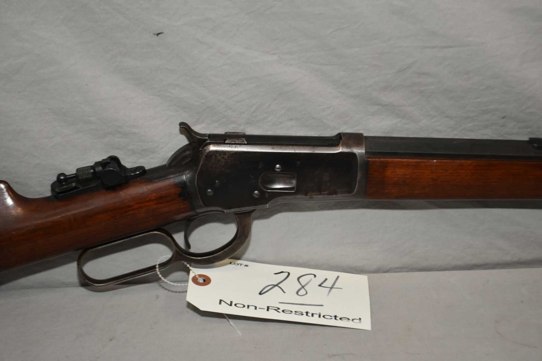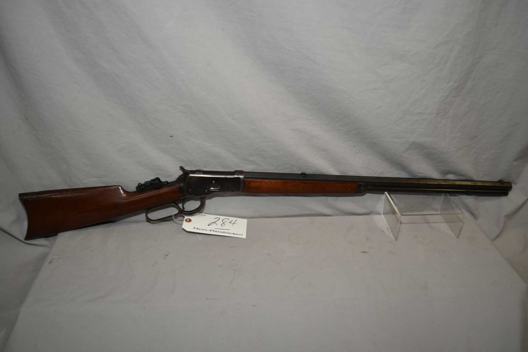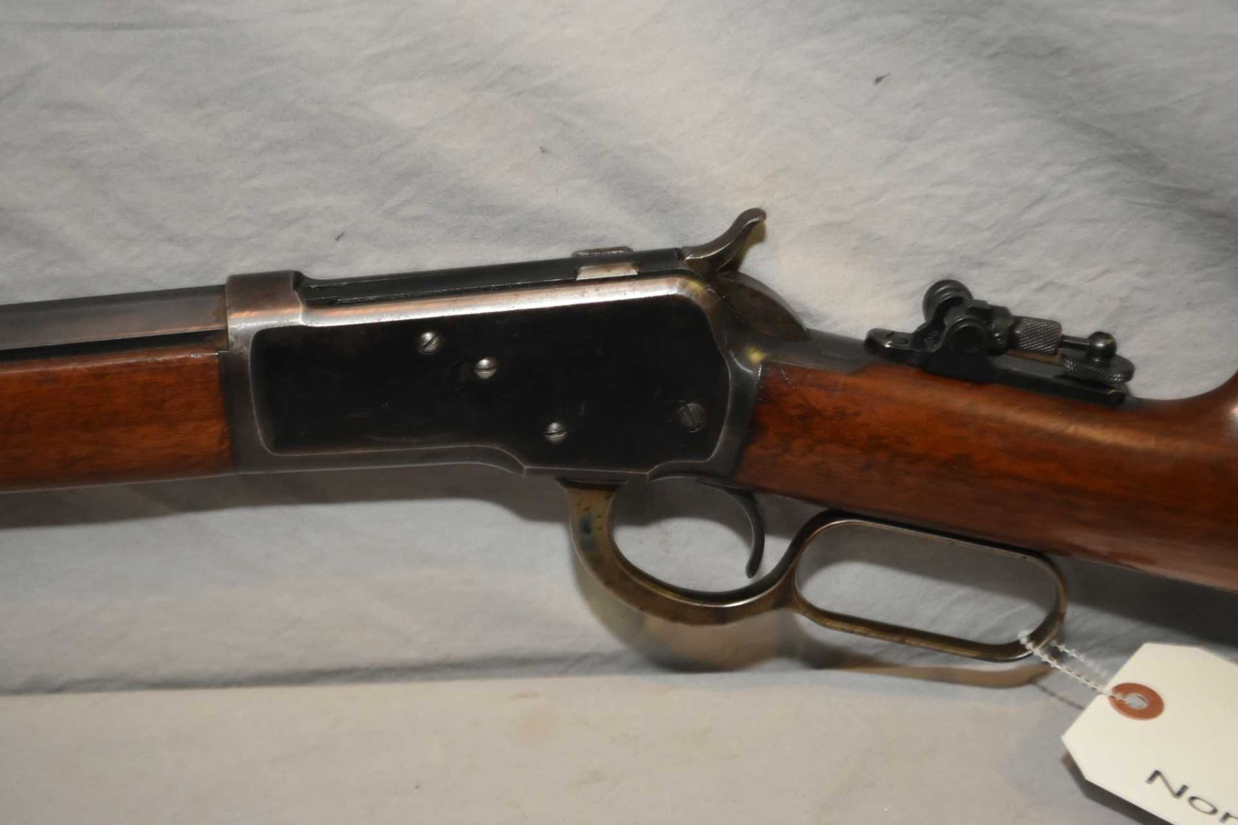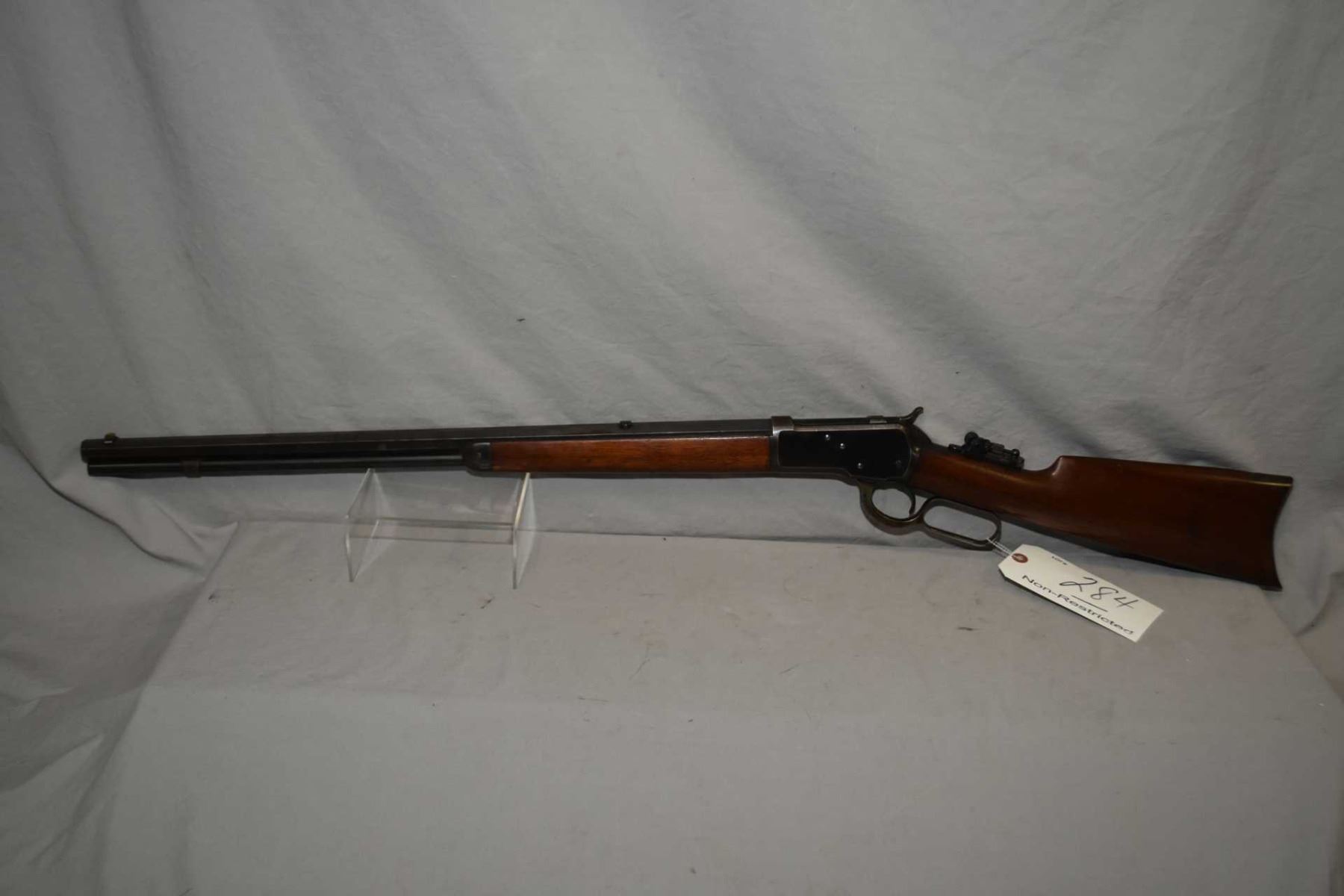 Winchester Model 1892 .25 - 20 WCF Cal Lever Action Rifle w/ 24" octagon barrel full mag [ patchy fading blue finish with some light pitting, back sight removed and wedge installled, Marbles tang sight, good wood with few marks, metal crescent butt plate, Circa 1905 ] Ser # 286360