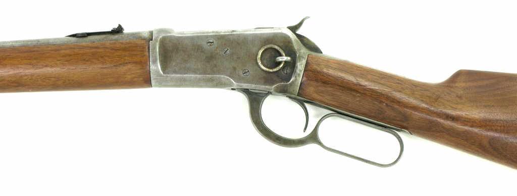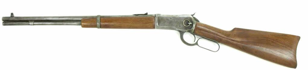 lever action carbine 20" barrel. Carbine remains good condition, metal parts display silver gray drifting toward brown. Walnut stocks show refinish, no cracks or repairs. Good action, fair bore. Mfg'd 1909, FFL required.