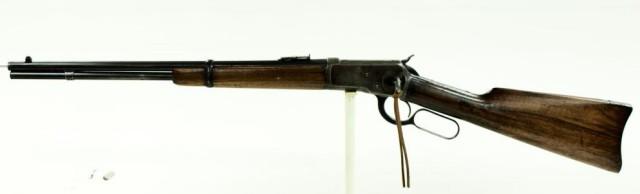 saddle ring carbine with 20" barrel and full magazine all features as standard. Carbine shows thinning blue drifting to brown on barrel and magazine with areas of gray, receiver a gray brown patina, original saddle ring intact, rearsight intact and graduated 0-20 yards and pinned front sight. Lever shows 50-60% original blue, the hammer with 30-40%. Original stocks intact with two kill marks cut in left side and overall good condition. A nice honest carbine with goodaction and bore. Manufactured in 1923. FFL required.