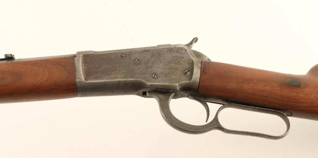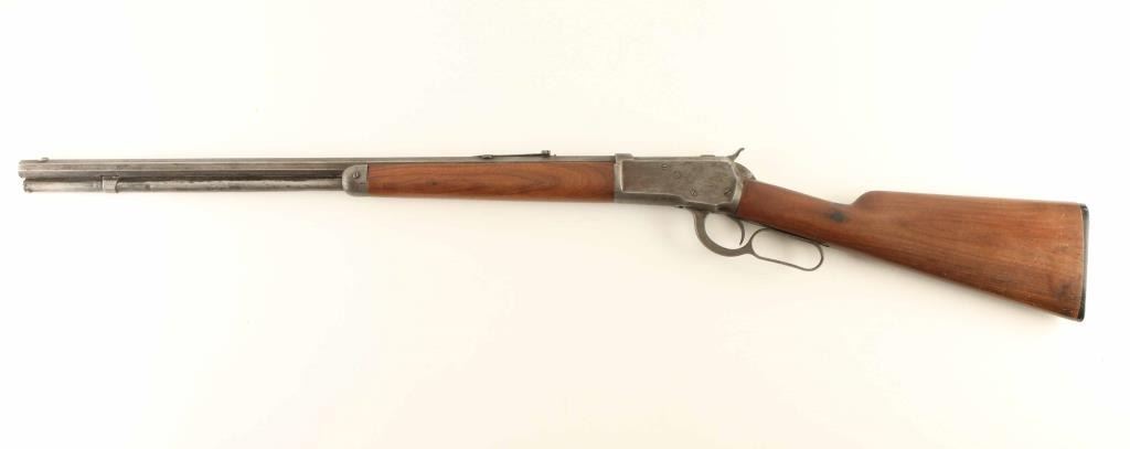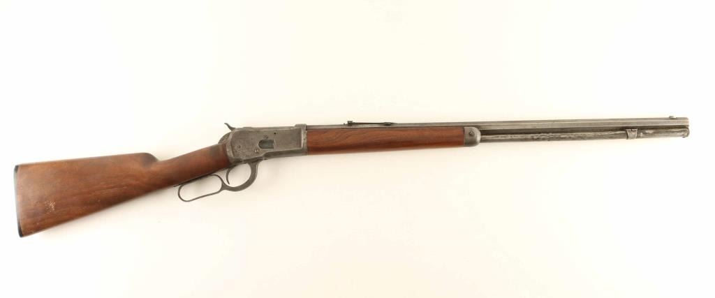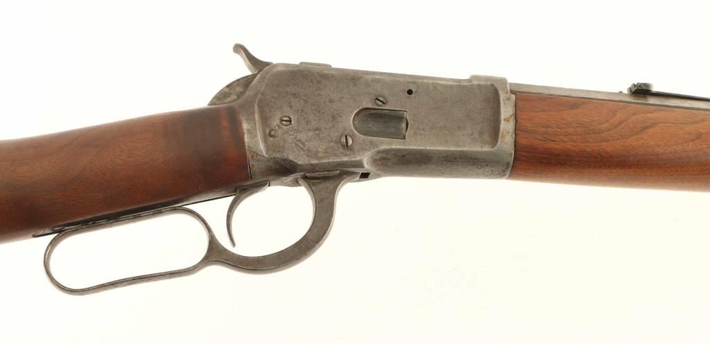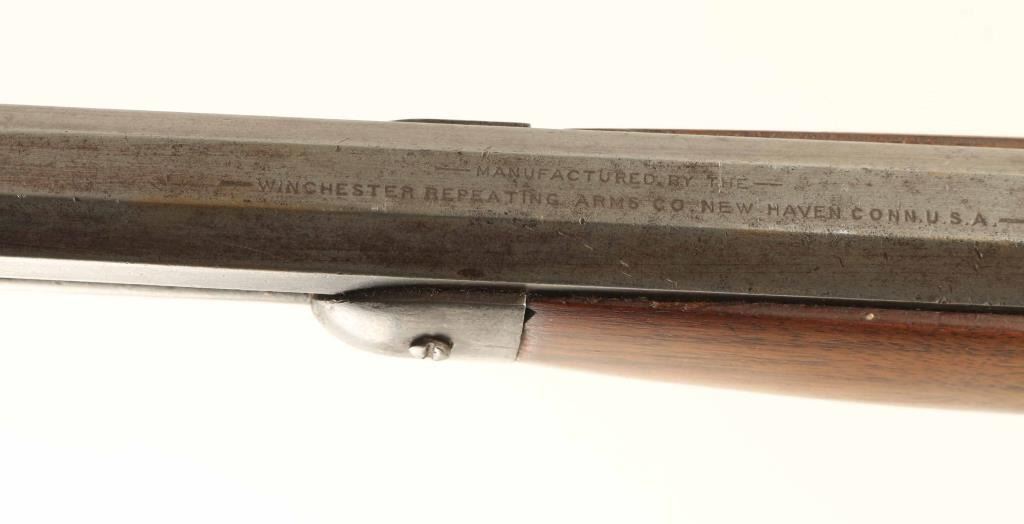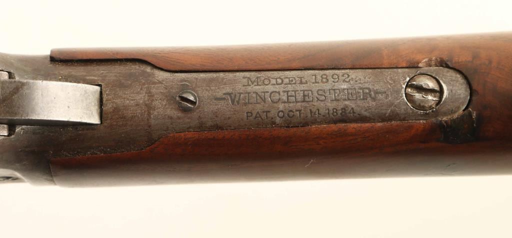 Antique lever action rifle chambered for 32 WCF (32-20), manufactured circa 1896. Features straight wrist stock, 24" octagon barrel, full length magazine tube, blade front sight, folding buckhorn rear sight, flat ribbed plastic buttplate. Bore is frosted and somewhat dark, with clear edges to rifling, some leading in grooves. Metal appears an even gray throughout, with darker areas of brownish finish in recess, at receiver scallops, places on barrel flats, darker speckling on receiver sides. Magazine tube has many small dents, slightly flared and gouged at muzzle end; magazine cap fit is a bit off. Muzzle shows some denting on outer edge of bottom flat. Barrel has several small tool marks on both sides at flats mid-barrel. Forend cap screws are partly backed out, and cap is mounted at a slight angle. Rear tang screw head and slot are damaged from use of a poor fitting screwdriver. Forend wood is smooth and has flat top edge with very little wood missing from right top edge, no visible cracks. Stock is in good condition with smooth wood and little loss; visible repairs at top tang, left wrist; several hairline cracks or splits up to 3" long on left butt from buttplate forward. Operation of lever is a bit stiff, appears due to dried grease and no lubricant. Internal action parts appear crisp edged and in very good condition. Barrel two line address and three line model/patent marking at tang are visible with crisp letters. "32 WCF" at chamber top is partly covered by creeping patina. Condition is NRA Good ***Antique Firearm***