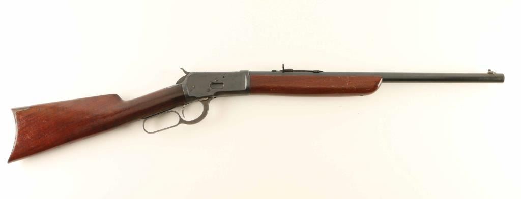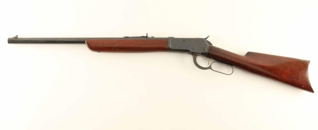 Custom lever action repeating rifle chambered in .32-20 Winchester, built utilizing a 1900 vintage receiver. Features a blued finish, Marlin 1893 20" medium contour barrel, dovetailed blade front sight with bead top, semi-buckhorn rear sporting sight, smooth trigger, knurled hammer spur, half length magazine tube concealed by an oversized walnut forend, and straight grip shoulder stock with crescent metal buttplate. Rifle retains approximately 80% of it's custom finish showing some old pin prick pitting on the receiver under the finish. Action is smooth, the bore is excellent and the high gloss finished wood stocks are good showing several small repairs. Condition is NRA Good as custom built. ***C&R Firearm***