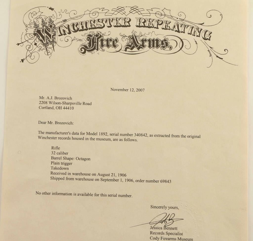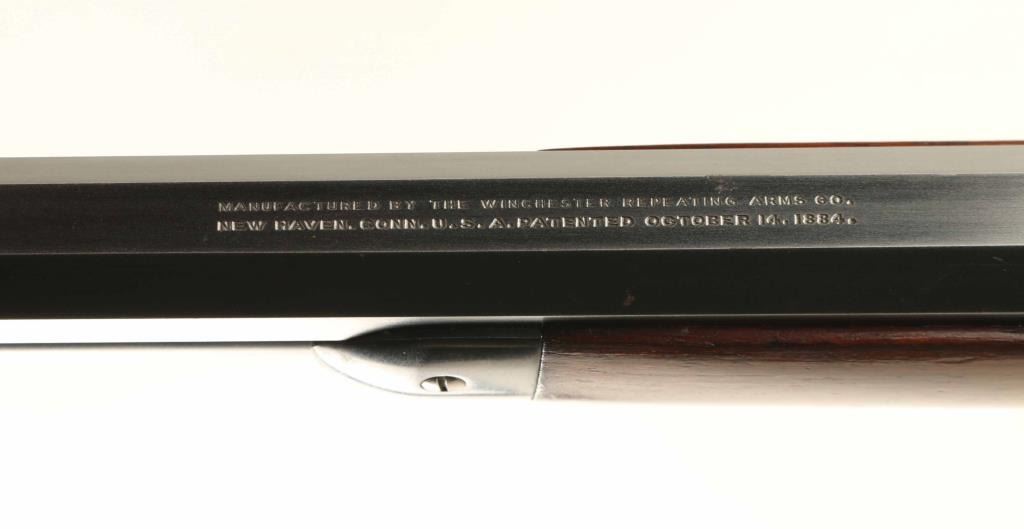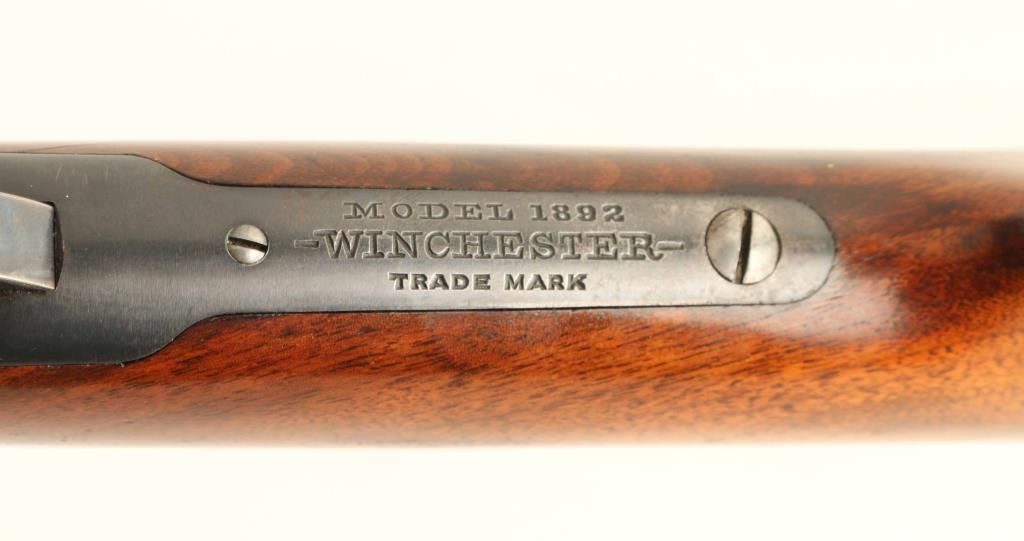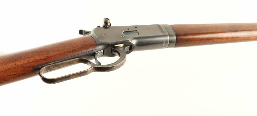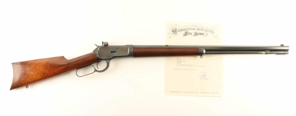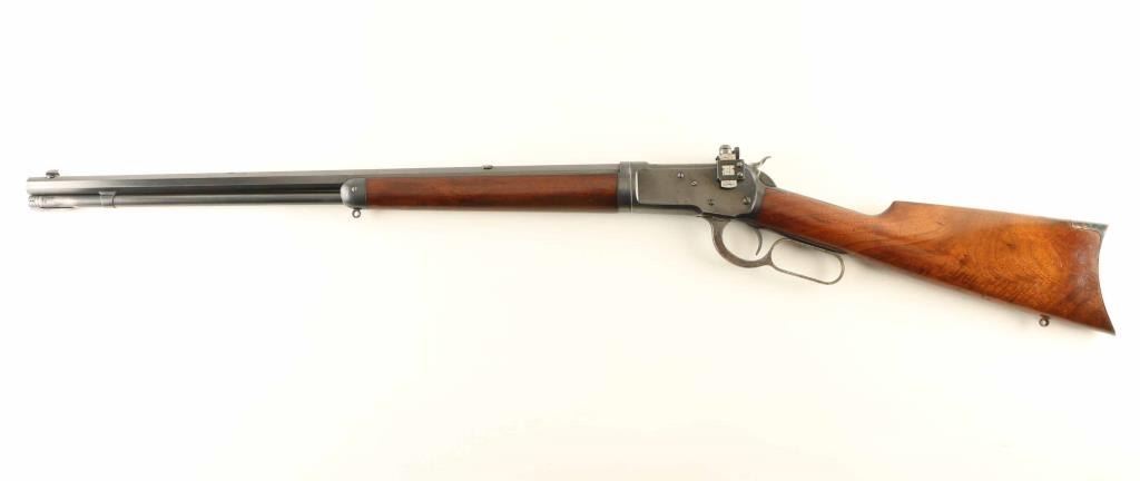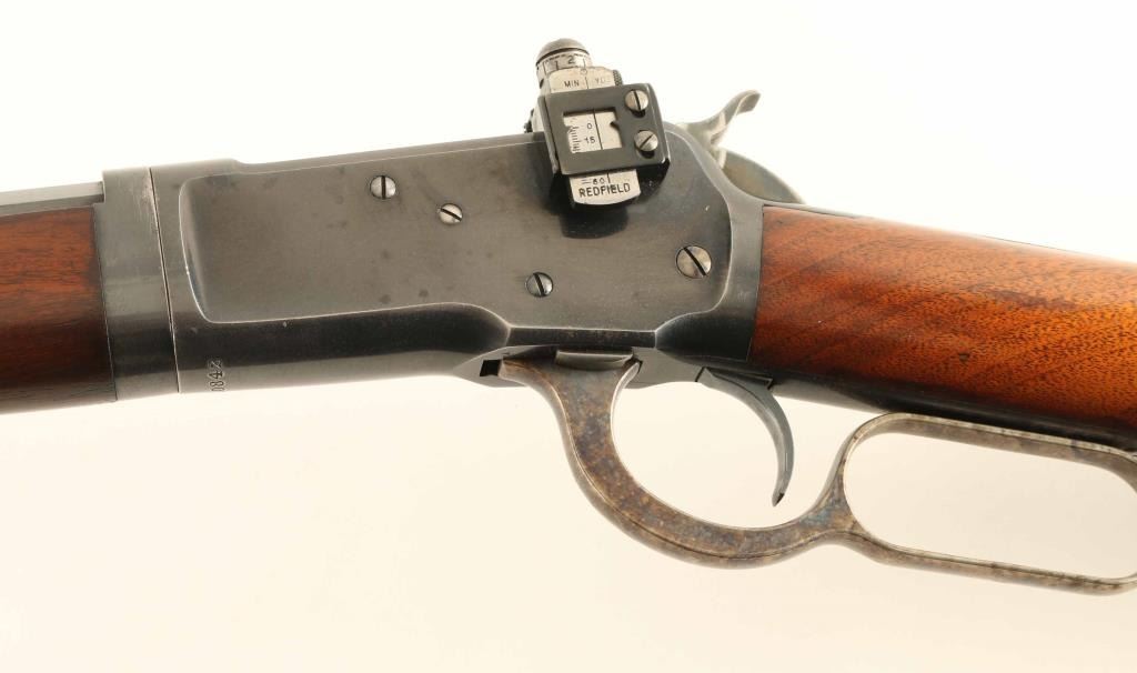Takedown 'Sporting Rifle' manufactured circa 1906. Refinished. Features 24" octagon barrel, full length magazine tube, takedown lever at magazine cap, blade front sight, rear sight barrel dovetail filled with Redfield blank, Redfield adjustable peep sight mounted to receiver, straight grip, steel crescent buttplate, eyelet type sling studs. Bore is good condition, frosted with sharp rifling. Retains 80% blued finish, thinning or showing bare metal on receiver bottom, forward part of magazine tube, at tangs. Barrel shows some nicks and scuff marks. Front sight dovetail is a bit high, with slight gap visible from side. Receiver shows good finish coverage on sides, some scratches, with different surface finish on front halves revealing partial polishing before reblue. Finger lever and buttplate are very good condition with bright case color. Forend is good condition with good fit to metal. Butt is good condition with creases and dents, fair fit to buttplate, slight shrinkage at tang. Markings are mostly deep and clear, with two line barrel address showing a slightly more shallow top line. Action operates smoothly. Includes letter from Cody Firearms Museum / Buffalo Bill Historical Center listing manufacturer's data for this rifle as shipped from the factory. Condition is NRA Very Good - refinished *** C&R Firearm ***