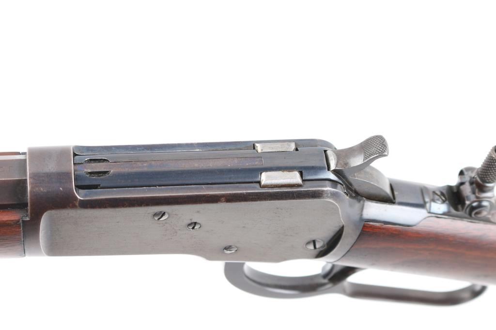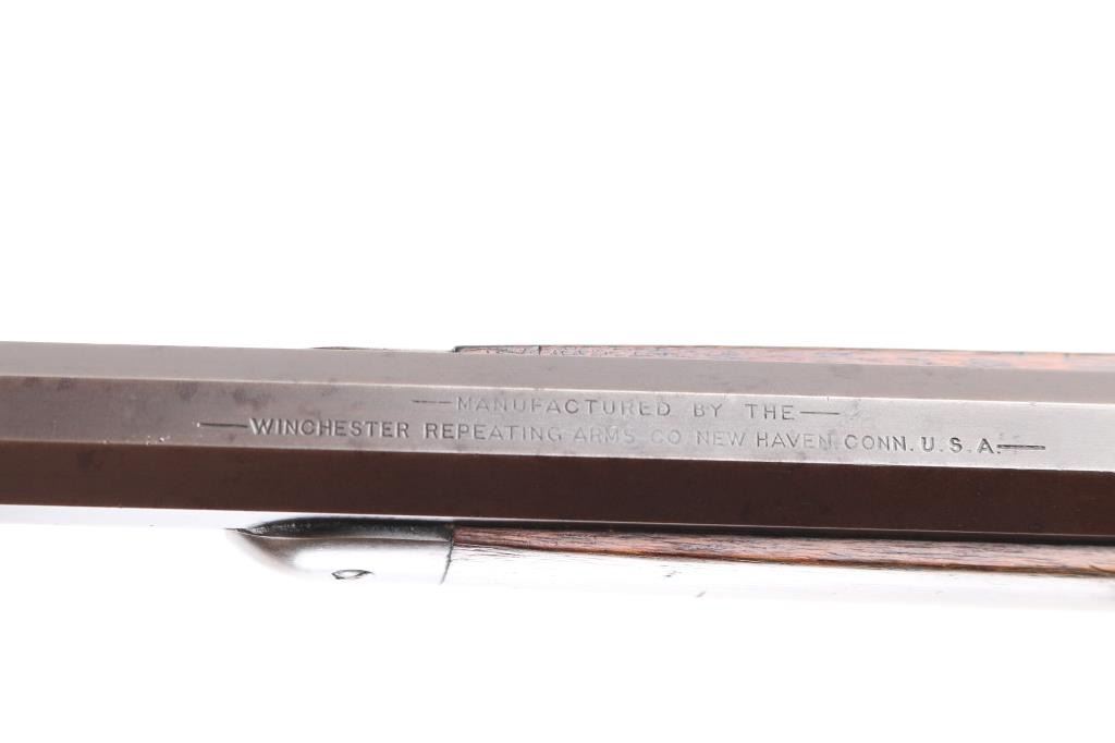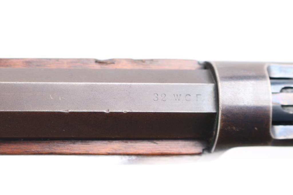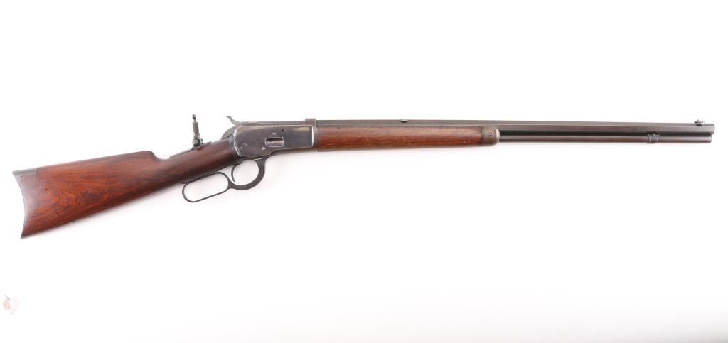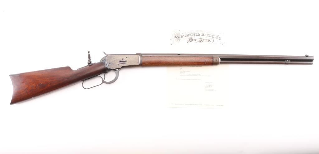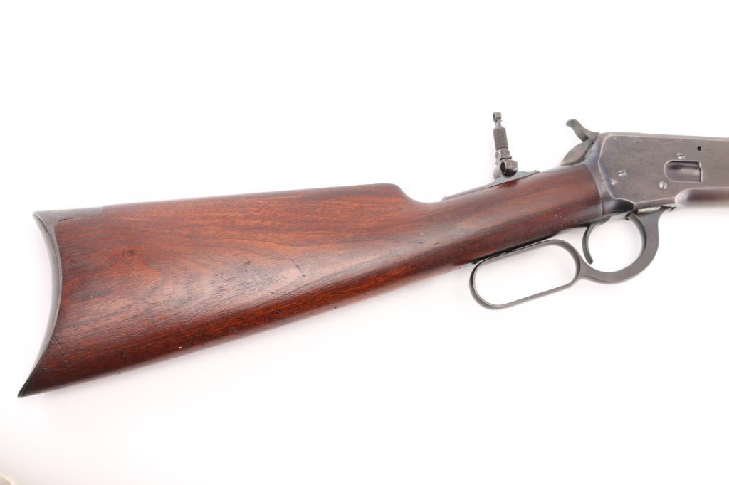 Antique lever action rifle manufactured circa 1892, first year of production. Chambered for 32-20. Features 24-1/4" octagon barrel, full length magazine tube, dovetailed two position (protected post or blade) front sight, adjustable folding rear tang mounted peep sight, dovetail mid-barrel filled with blank, smooth walnut forend & straight wristed buttstock, steel crescent buttplate. Bore is good to very good condition, very bright, with some pitting visible. Retains 40% bright original blued finish. Good color retained on bolt, receiver sides, bottom flats of barrel, on tangs. Remainder of metal retains a faded or thinning finish with brown tones, showing edge losses. Finger lever shows faded dark case color. Loading gate and extractor show bright bluish temper color. Wood is very good, lightly varnished, small dents. Markings on barrel readable. Action is smooth. Includes factory letter stating 32 caliber and octagon barrel. Condition is NRA Very Good *** Antique Firearm ***