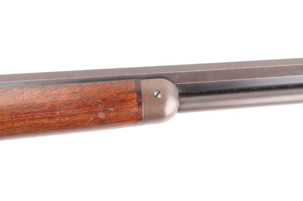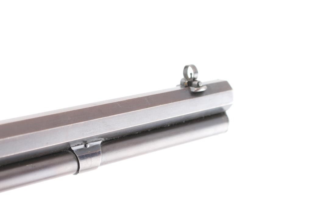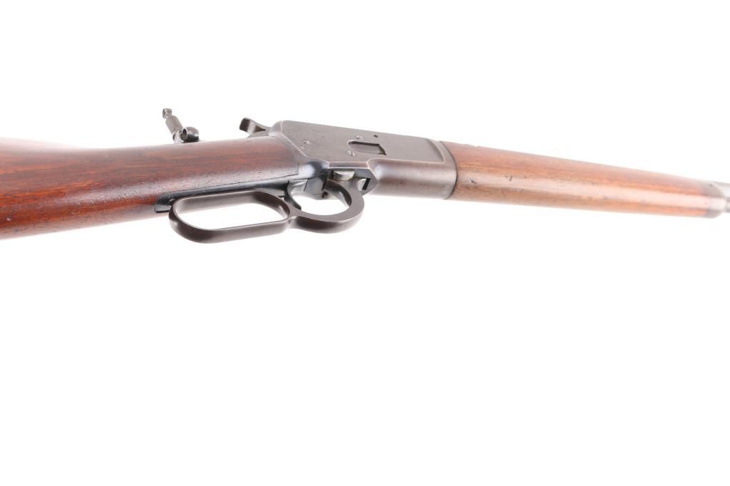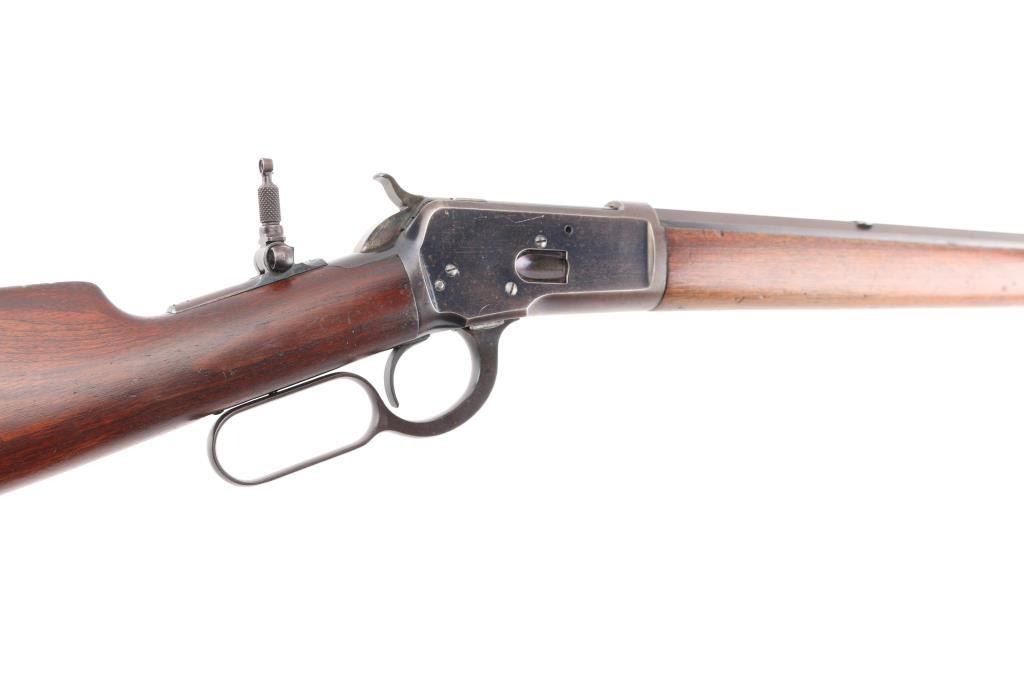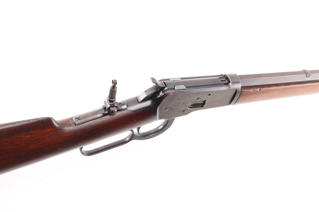Antique lever action rifle manufactured circa 1892, first year of production. Chambered for 32-20. Features 24-1/4" octagon barrel, full length magazine tube, dovetailed two position (protected post or blade) front sight, adjustable folding rear tang mounted peep sight, dovetail mid-barrel filled with blank, smooth walnut forend & straight wristed buttstock, steel crescent buttplate. Bore is good to very good condition, very bright, with some pitting visible. Retains 40% bright original blued finish. Good color retained on bolt, receiver sides, bottom flats of barrel, on tangs. Remainder of metal retains a faded or thinning finish with brown tones, showing edge losses. Finger lever shows faded dark case color. Loading gate and extractor show bright bluish temper color. Wood is very good, lightly varnished, small dents. Markings on barrel readable. Action is smooth. Includes factory letter stating 32 caliber and octagon barrel. Condition is NRA Very Good *** Antique Firearm ***