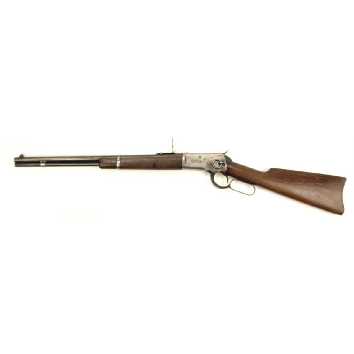 Winchester Model 1892 .32 cal. SN 804833 lever action carbine 19 1/2" barrel, full magazine, walnut stocks with carbine butt. Barrel shows original 10-15% blue remainder silver gray finish, mag tube bright blue, receiver silver gray with areas of brown, rear stock shows repaired crack to right side next to tang. Nice action with fair bore. Mfg'd 1916, FFL required.