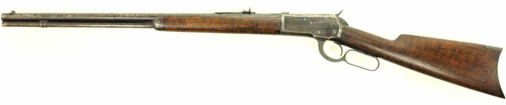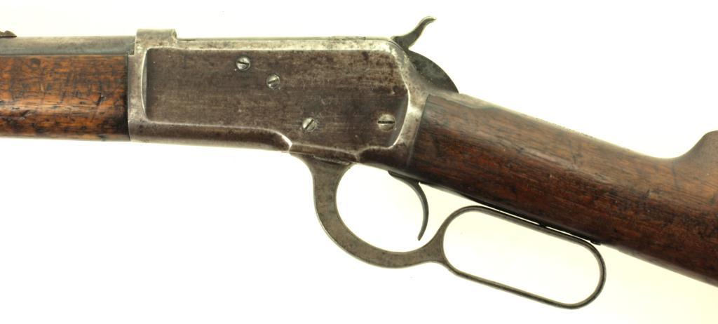 lever action rifle 24" round barrel, full magazine, straight grain walnut stocks and steel crescent butt plate. Barrel, magazine tube and receiver show blue in protected area, majority gray drifting brown with scattered areas of light erosion, original walnut stocks show moderate use dings and dents, no cracks or repairs. First year production 92' with good action, fair bore. Mfg'd 1892, NO FFL required.