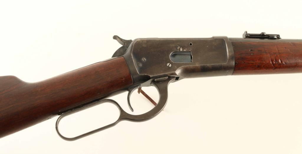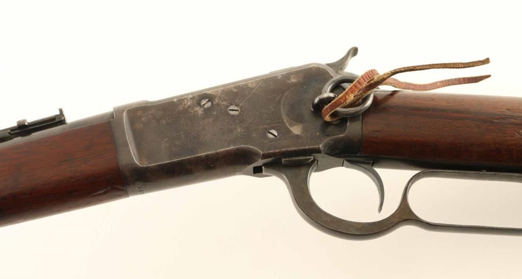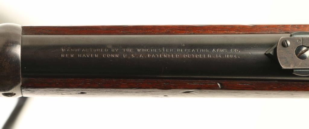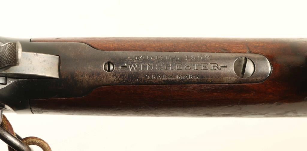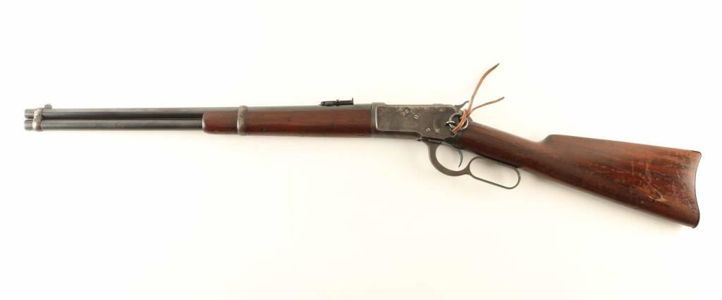 'Saddle Ring Carbine' manufactured circa 1905. Features 20" barrel, full length magazine tube, blade front sight, folding ladder rear sight, straight wrist, curved steel buttplate, saddle ring. Bore is very good to excellent condition. Retains 60% finish with bare metal from cleaned patina at receiver & bands, bare metal from rubbing at sharp edges. Screw slots are fair to good with some marring in places. Wood is good serviceable condition with many dents & scratches, loss of varnish and scraping on butt, fair fit to metal with some rounding at corners where wrist meets receiver. Markings appear proper depth & readable. Action operates smoothly. Condition is NRA Good+ *** C&R Firearm ***