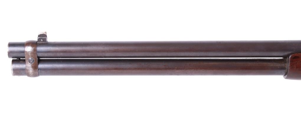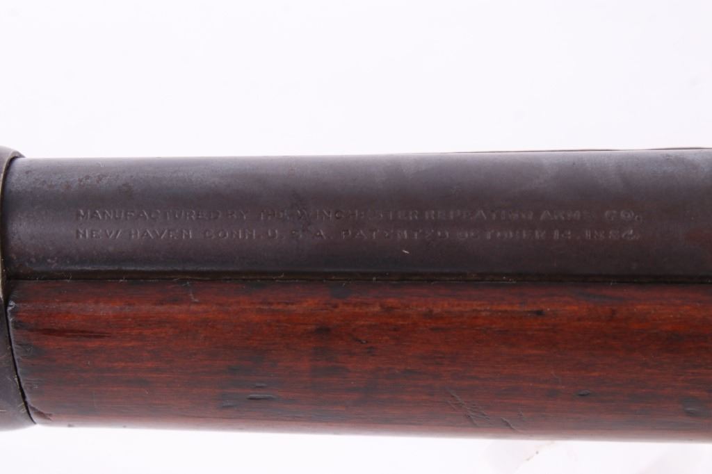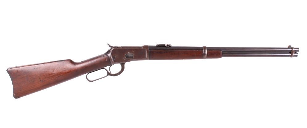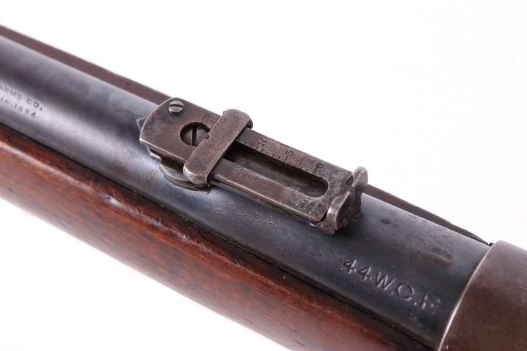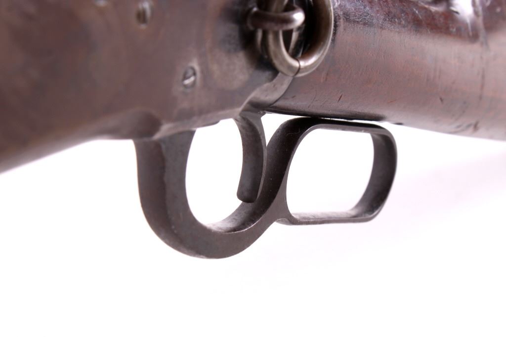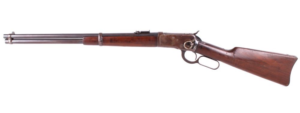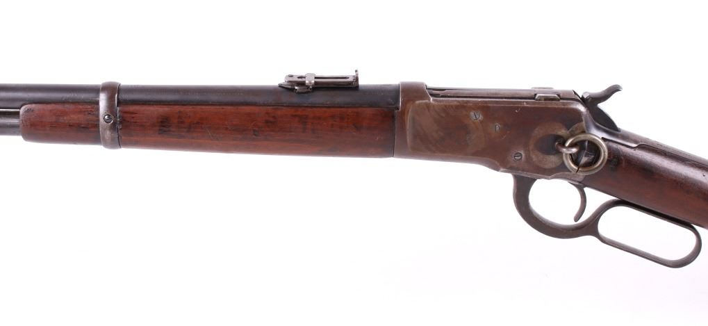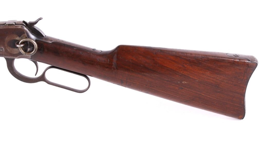 For your consideration is a Winchester Model 1892 Saddle Ring Carbine in desirable, big .44-40 caliber, made in 1916. This carbine with serial number 817283 is in very fine and original overall condition. The Model 1892 was one of Jonathan Browning’s best designs that incorporated all of the strength of the famed large caliber Model 1886 into a compact receiver intended for revolver length cartridges. Many frontiersmen and woodsmen relied on one size ammunition for both handgun and long gun needs. The Model 1892 replaced the relatively weak Model 1873 action and was intended to digest modern, smokeless powder ammunition. More full length, 24” barreled rifles were produced by Winchester than 20” barreled carbines. This makes carbines much more difficult for collectors and shooters to locate today. Of the rifles and carbines available on the collector market, the smaller calibers like .25-20 and .32-20 predominate, making the .44-40 very difficult to obtain. Prices for .44-40 Saddle Ring Carbines and Rifles are typically twice or three times that of the smaller caliber models. This example shows fine blue on the barrel and magazine with only minor natural aging. The receiver is also uncleaned and now displays excellent deep blue on the loading gate and fine blue in the more protected areas with the balance a very desirable and pleasing plum/blue patina. The saddle ring is intact and the stock and forearm display nice grain quality with all wood to metal parts fitting closely and tight. Additionally, the bore is unusually bright with sharp rifling all the way through. This is uncommon as most carbines of this period saw hard use and the bore conditions reflect this by being worn, pitted or a combination of the two. The carbine is equipped with a correct Winchester carbine ladder sight with slide intact mated with a correct standard Winchester carbine front sight. All screw heads are in excellent condition indicating that this carbine has not been taken apart or worked on. All correct Winchester address and patent markings on the barrel are correct and sharp as are all Winchester proof marks and caliber designation. Additional Winchester Model 1892 markings are distinct on the upper tang. The action is tight and all springs are strong. The .44-40 caliber is the prize of the Model 1892 line of firearms and is especially difficult to locate in a saddle ring carbine. This is an extremely fine 103 year old example that would be right at home in the finest Winchester or Old West collection. This firearm qualifies as a Curio & Relic Long Gun, and requires FFL Transfer or NICS Background Check.