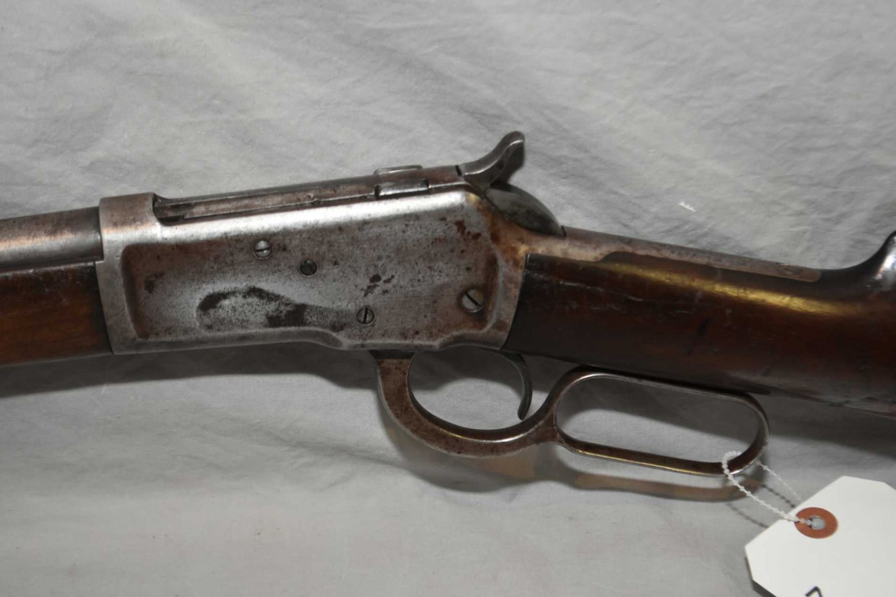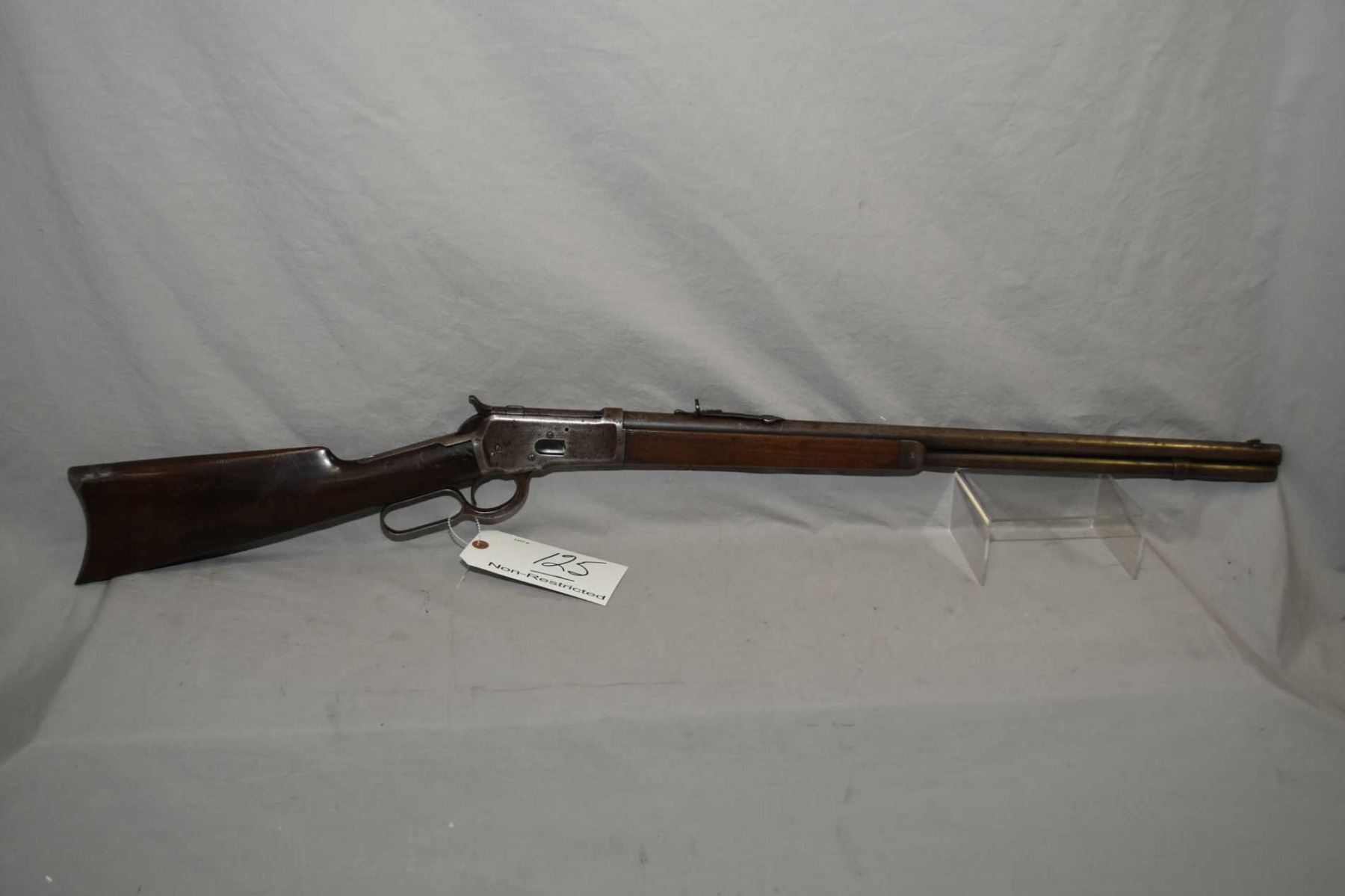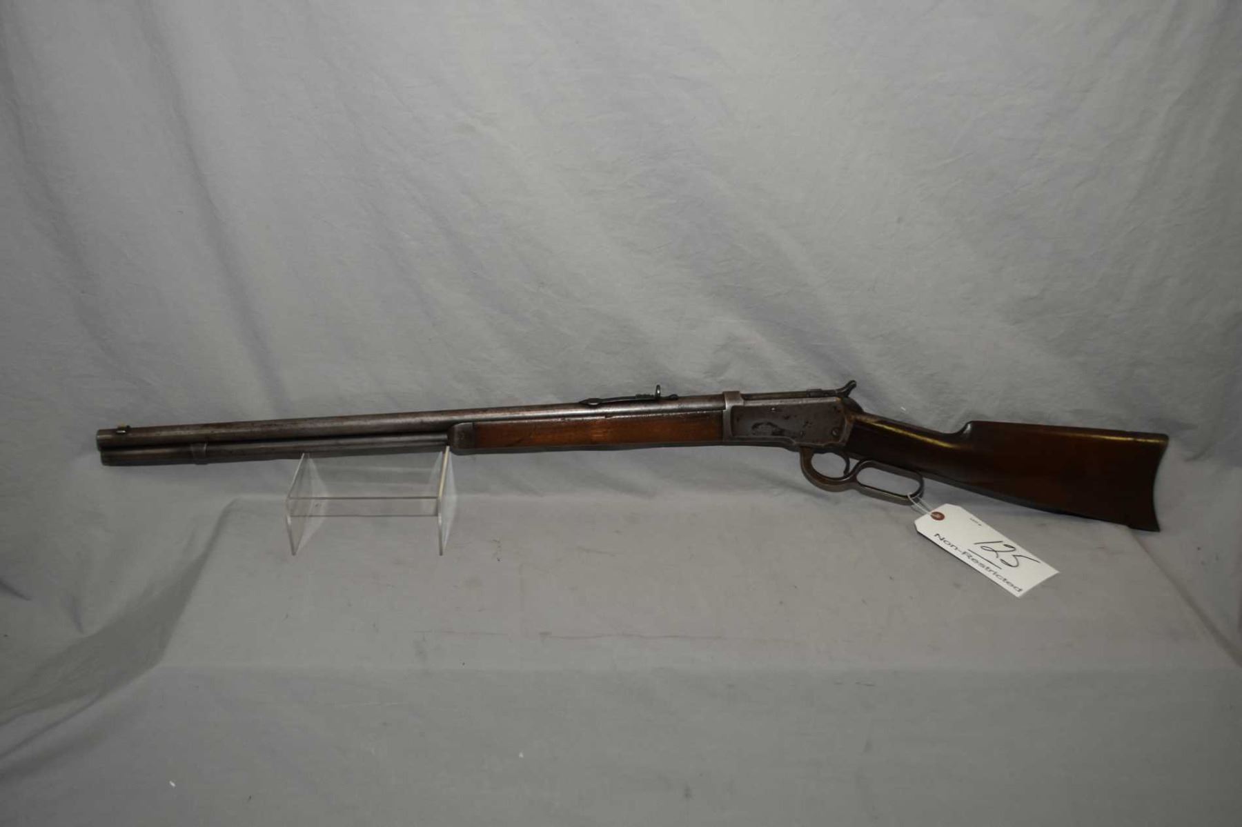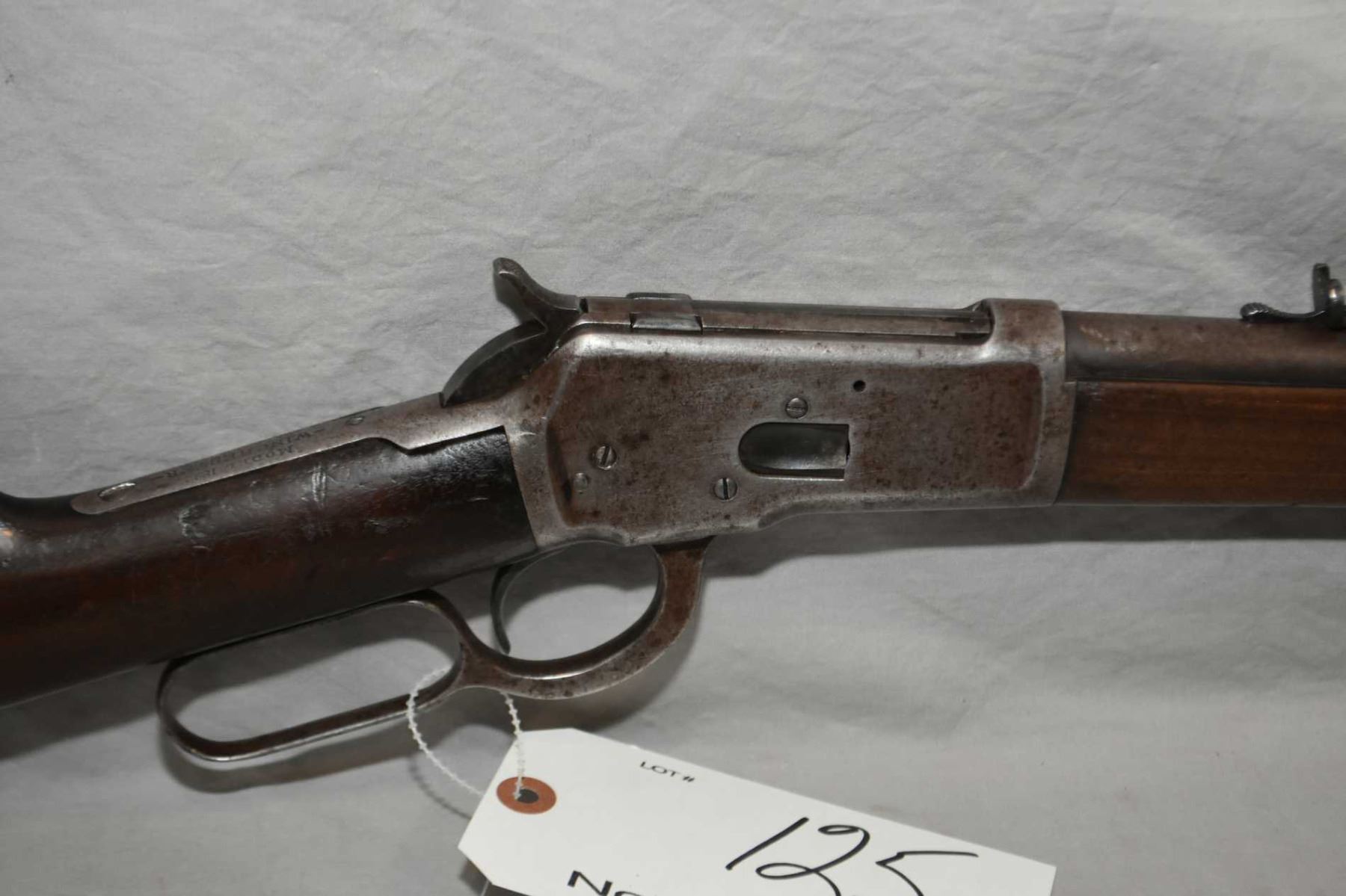 Winchester Model 1892 .44 WCF Cal Lever Action Rifle w/ 24" round barrel full mag [ blued finish, fading and turning brown, and patchy on receiver, barrel sights, good wood, with various marks, gouges, etc., metal crescent butt plate, Circa 1896 ] Ser # 122157