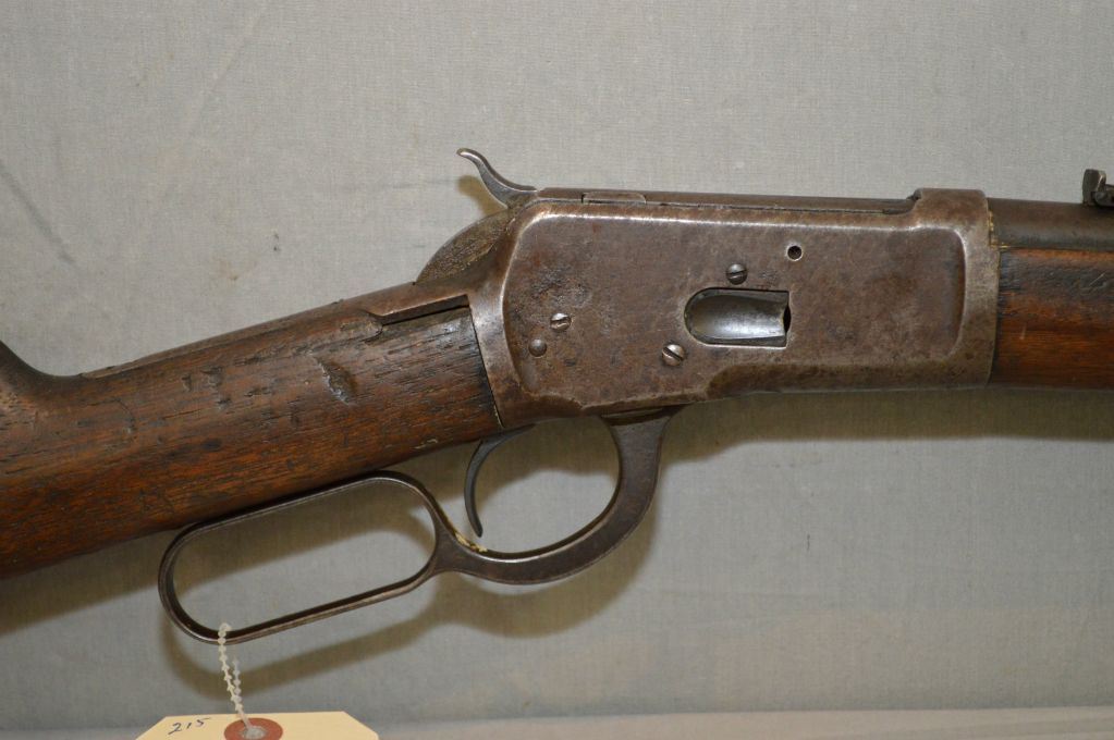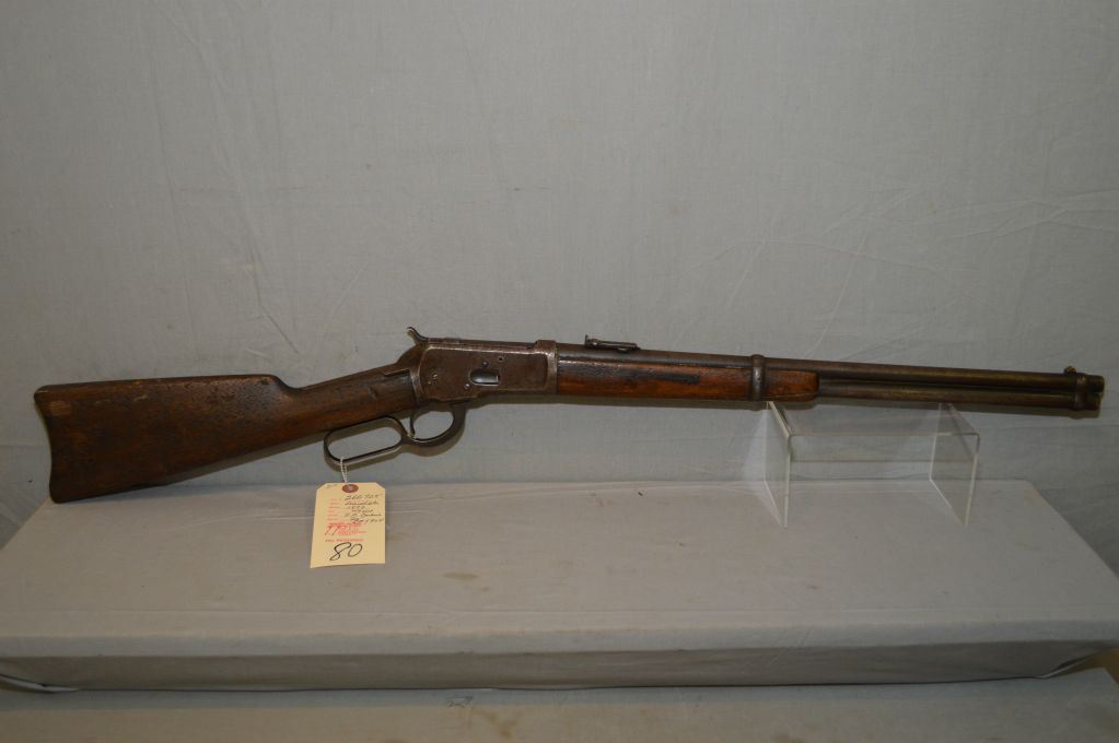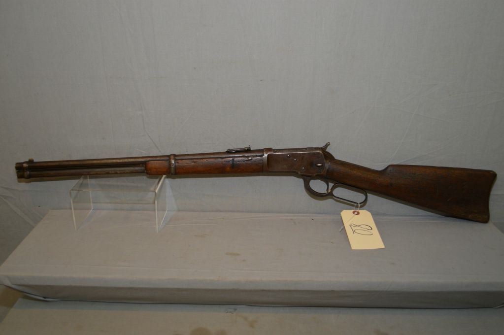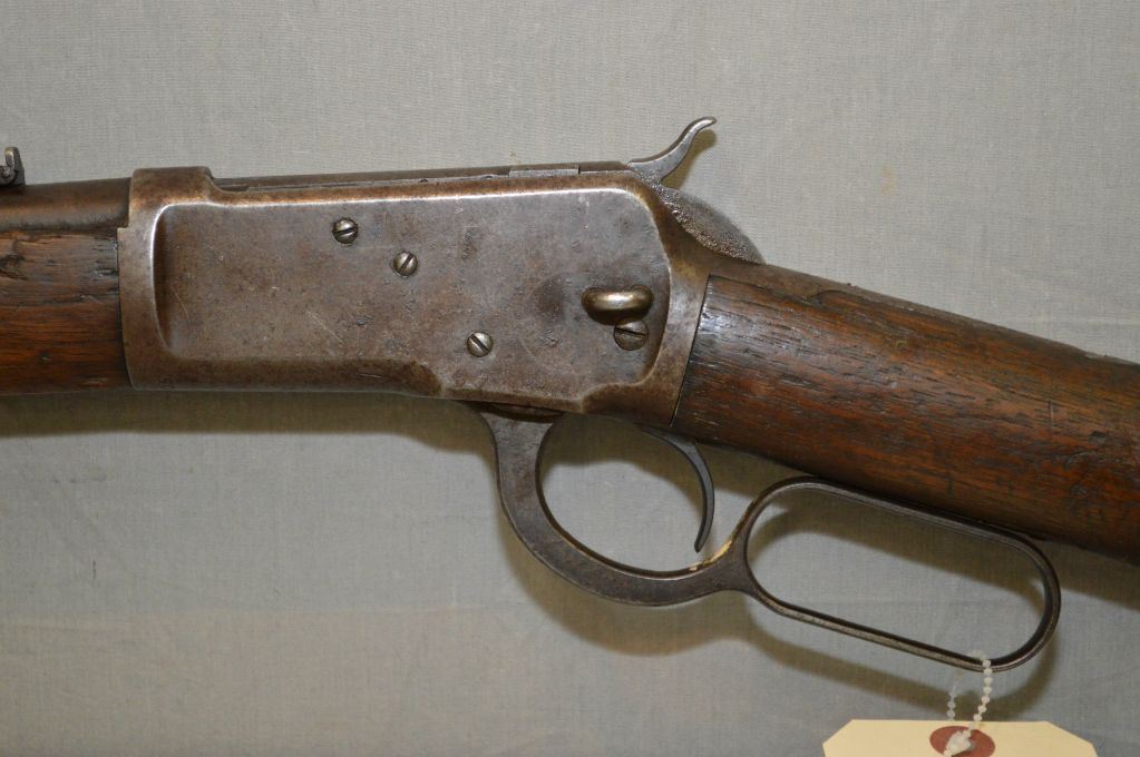 Winchester Model 1892 .44 WCF cal Lever Action Saddle Ring Carbine w/ 20" round bbl, full mag [ fading mottled blue finish turning brown, carbine sights, missing the ring but has the stud , dry marked wood, chipped at upper tang & cracked at forend, metal Carbine butt plate, Circa 1904 ( 67 ) ] Ser # 266705