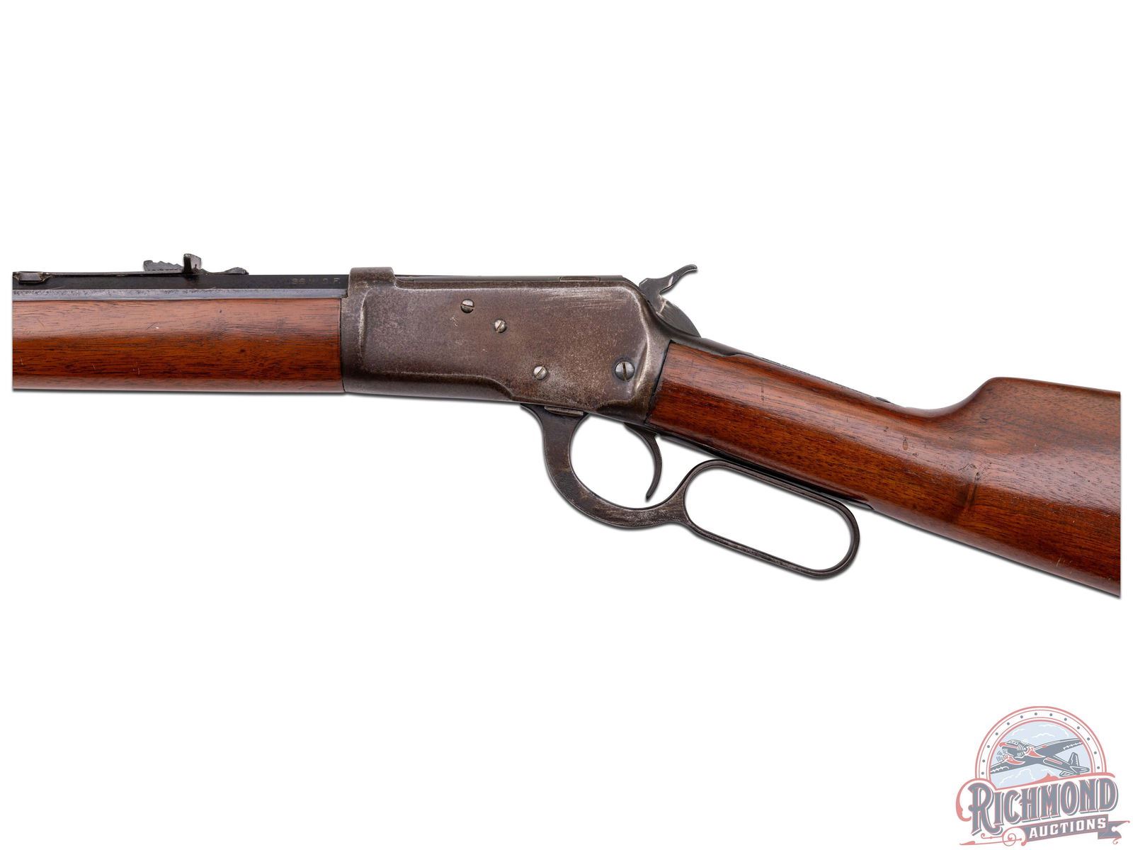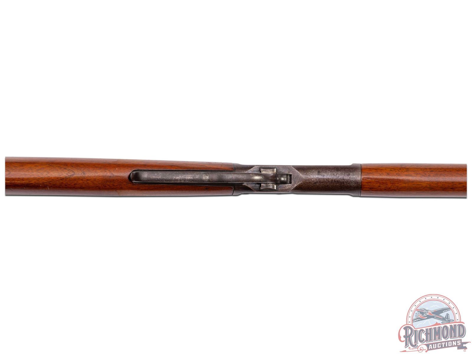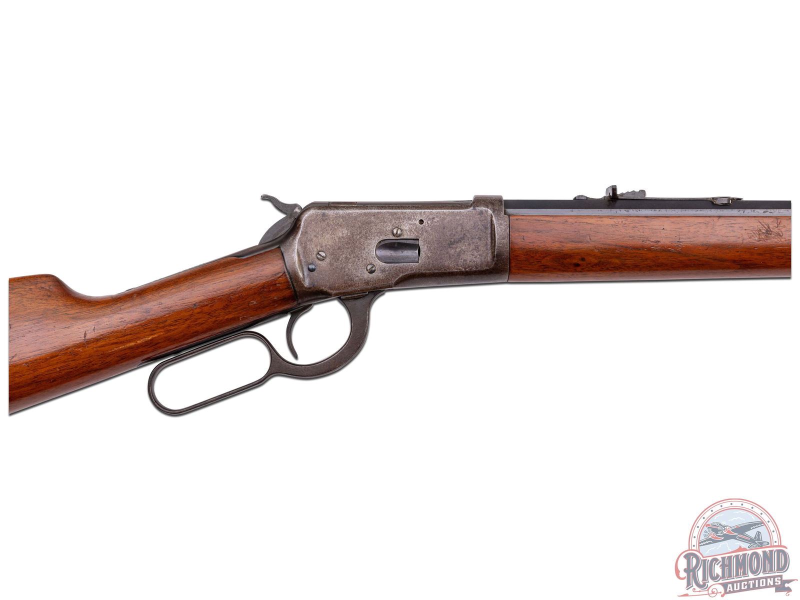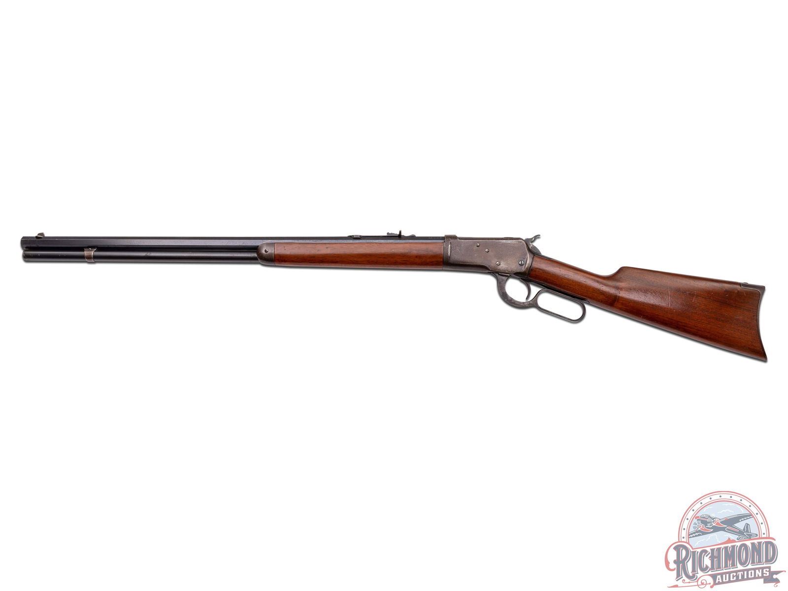 Manufactured in 1919. This sporting rifle features a 24" blued octagon barrel with original rear notch sight with elevator and blade front sight. Full length magazine tube with side loading gate. Barrel is stamped on the left flat with the two line Winchester address and "38 WCF" near the receiver. Winchester proof marks on barrel and receiver. Tang is stamped "MODEL 92 / -WINCHESTER- / TRADE MARK REG. US PAT OFF & FGN". Straight walnut wood stock with period correct metal crescent butt plate. Matching forearm with metal cap. LOP: 12-3/4". CALIBER: 38 WCF. S/N: 880325. FFL STATUS: Curio & Relic.