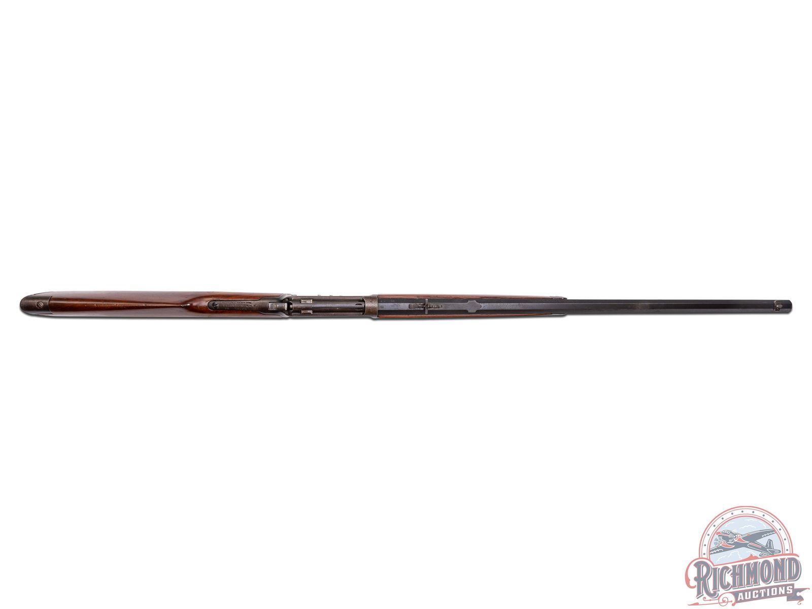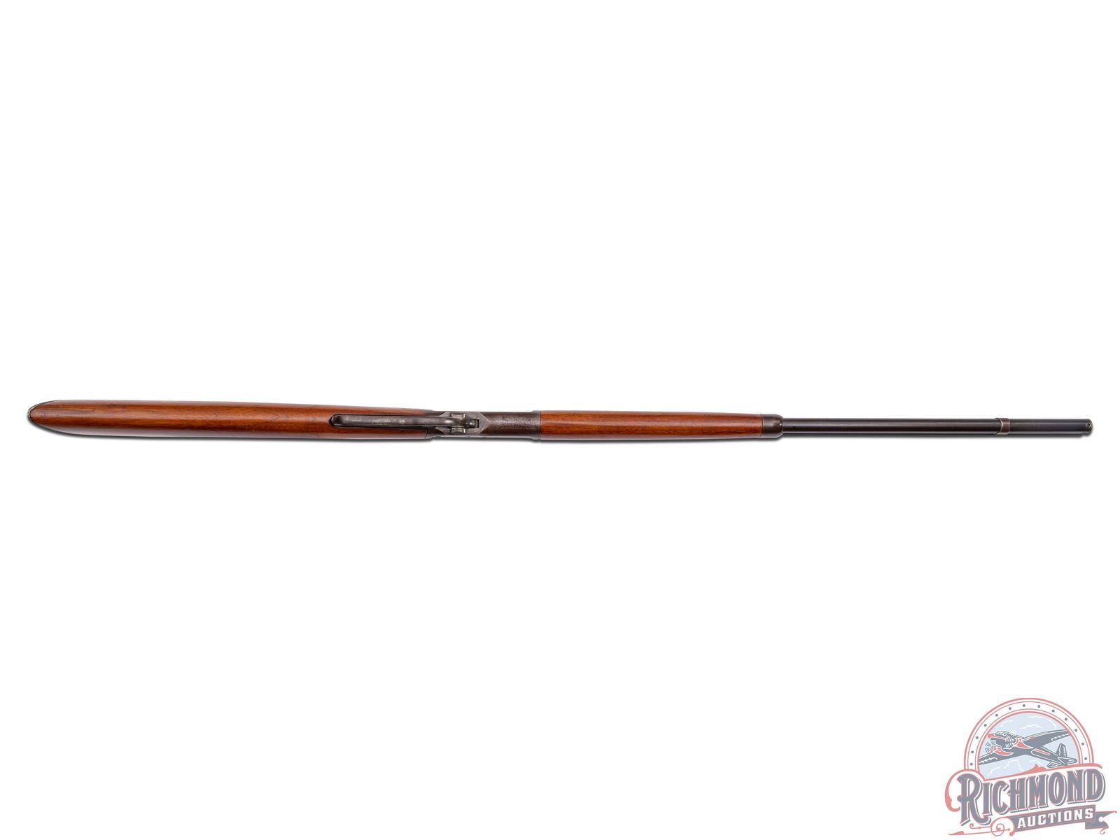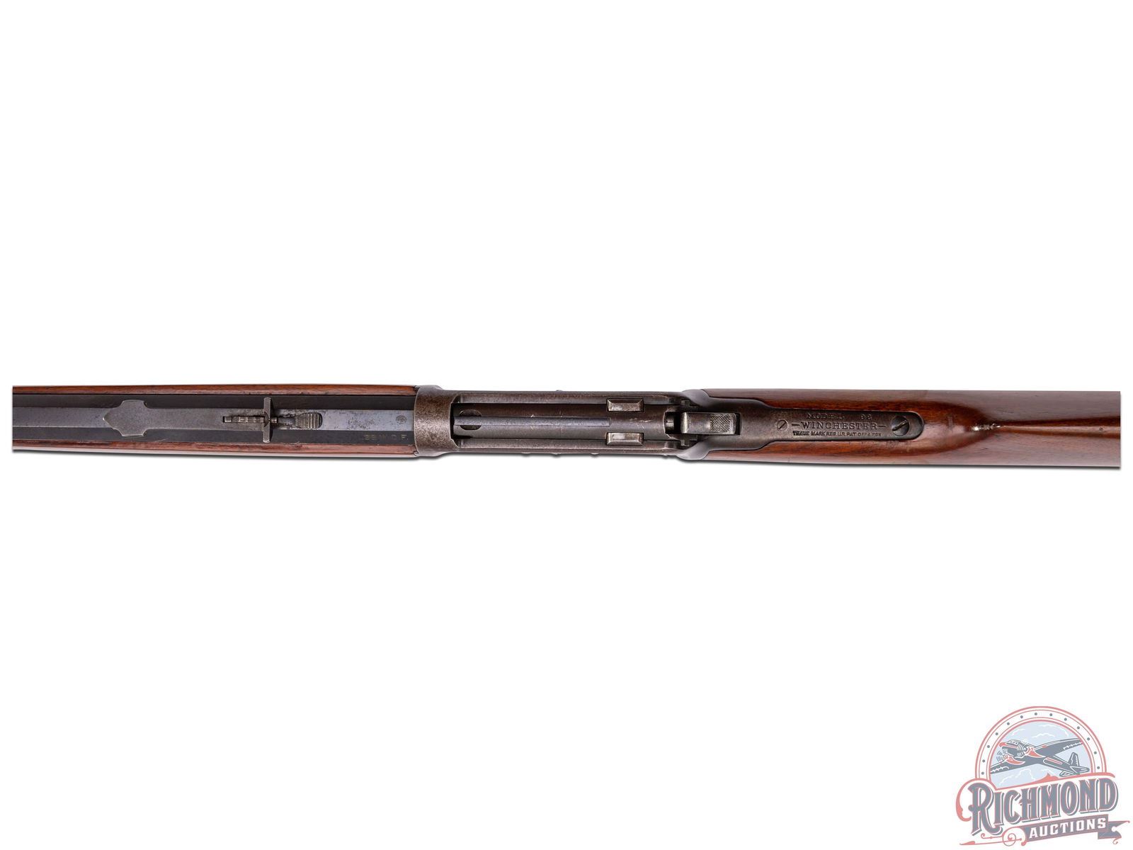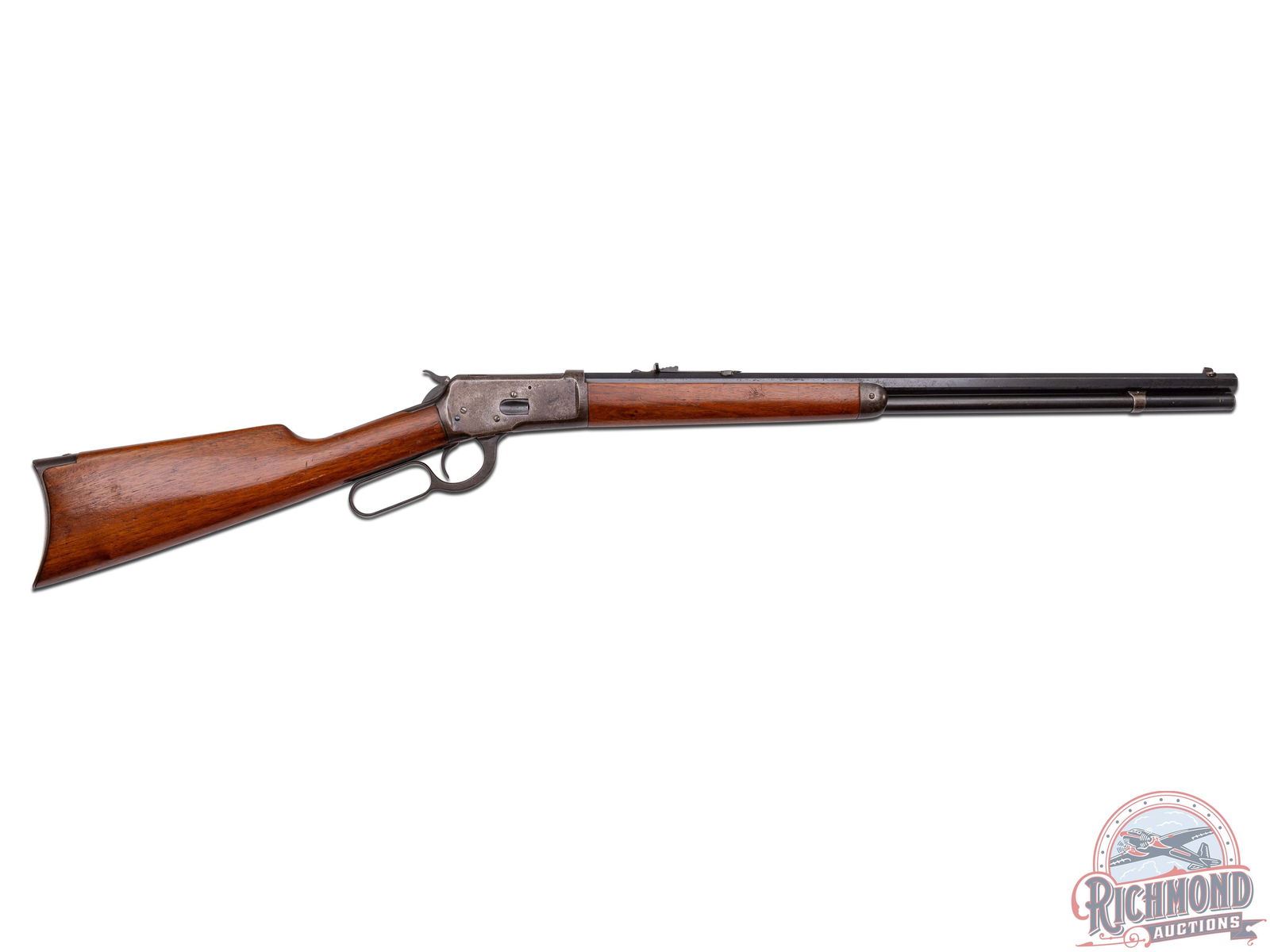 Manufactured in 1919. This sporting rifle features a 24" blued octagon barrel with original rear notch sight with elevator and blade front sight. Full length magazine tube with side loading gate. Barrel is stamped on the left flat with the two line Winchester address and "38 WCF" near the receiver. Winchester proof marks on barrel and receiver. Tang is stamped "MODEL 92 / -WINCHESTER- / TRADE MARK REG. US PAT OFF & FGN". Straight walnut wood stock with period correct metal crescent butt plate. Matching forearm with metal cap. LOP: 12-3/4". CALIBER: 38 WCF. S/N: 880325. FFL STATUS: Curio & Relic.