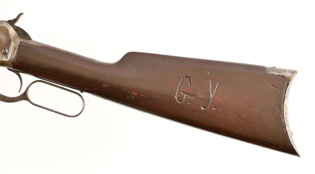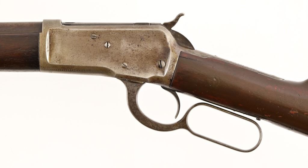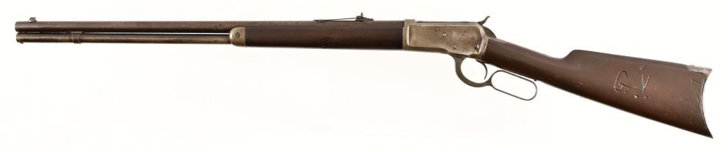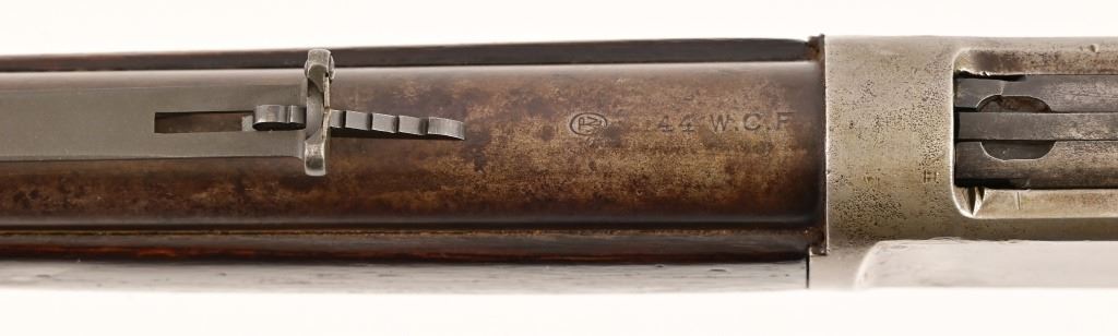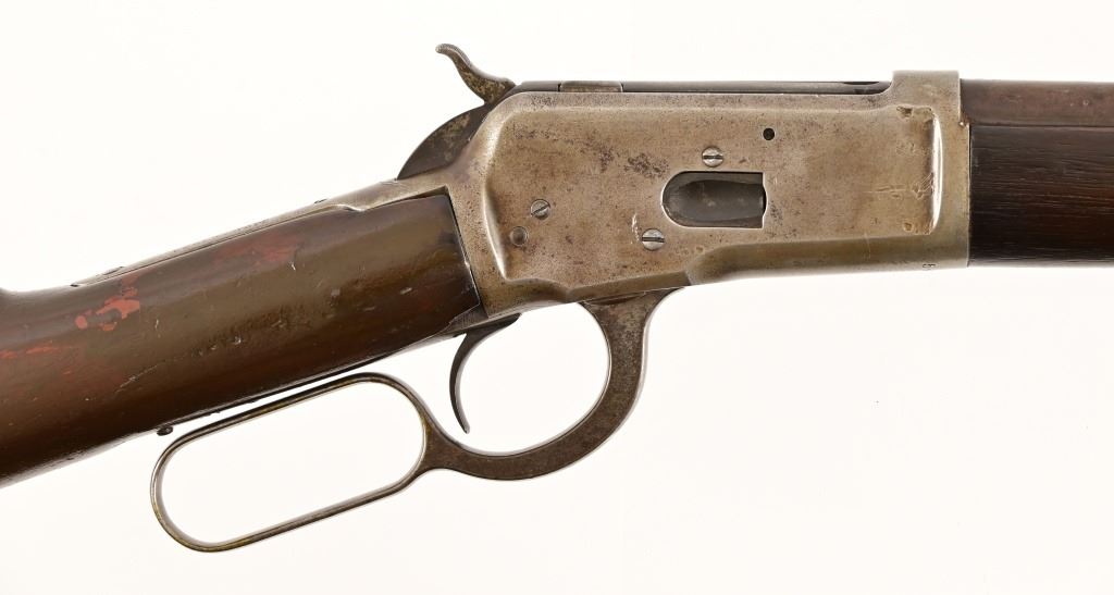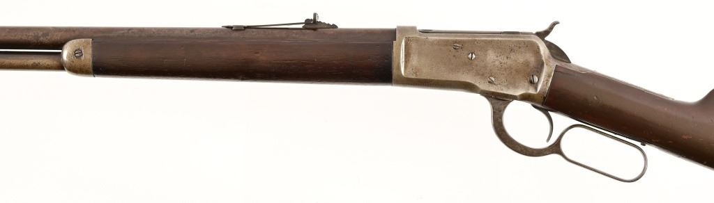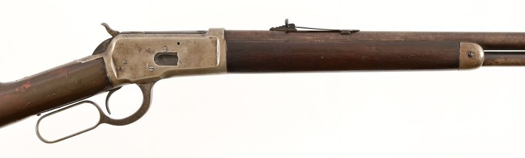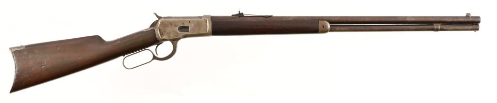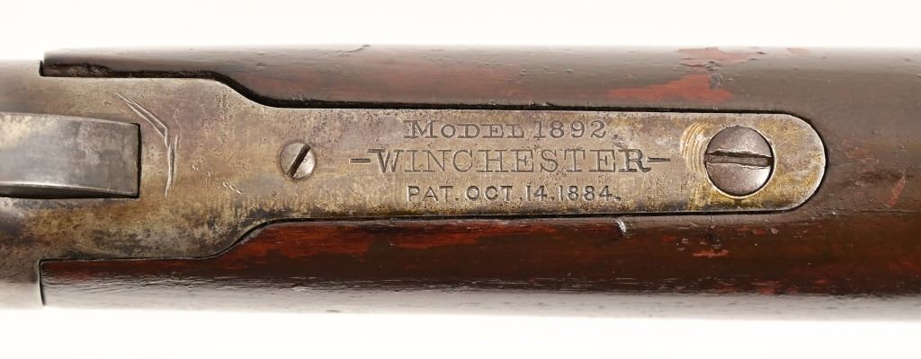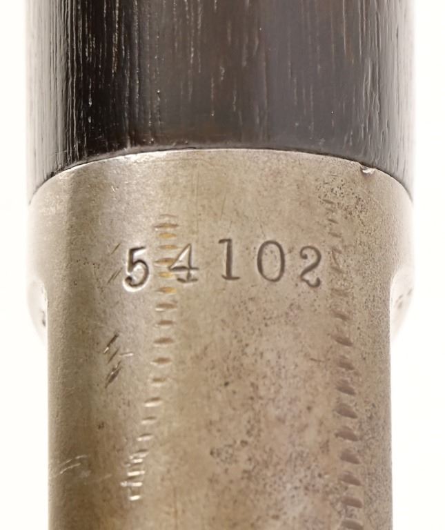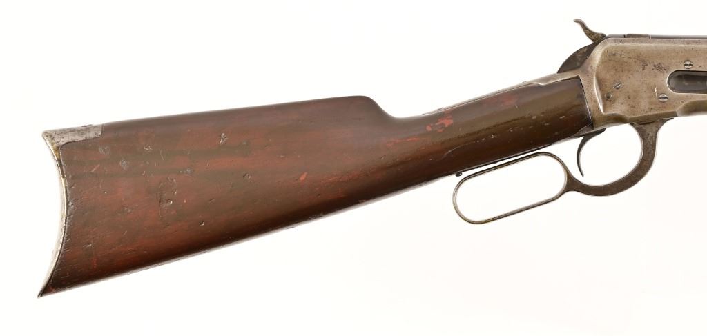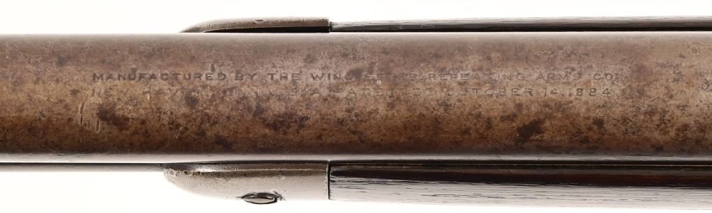 S/N 54102. Round 24" barrel. Made in 1896. Gray patina finish, original wood, crescent butt plate. . Antique.