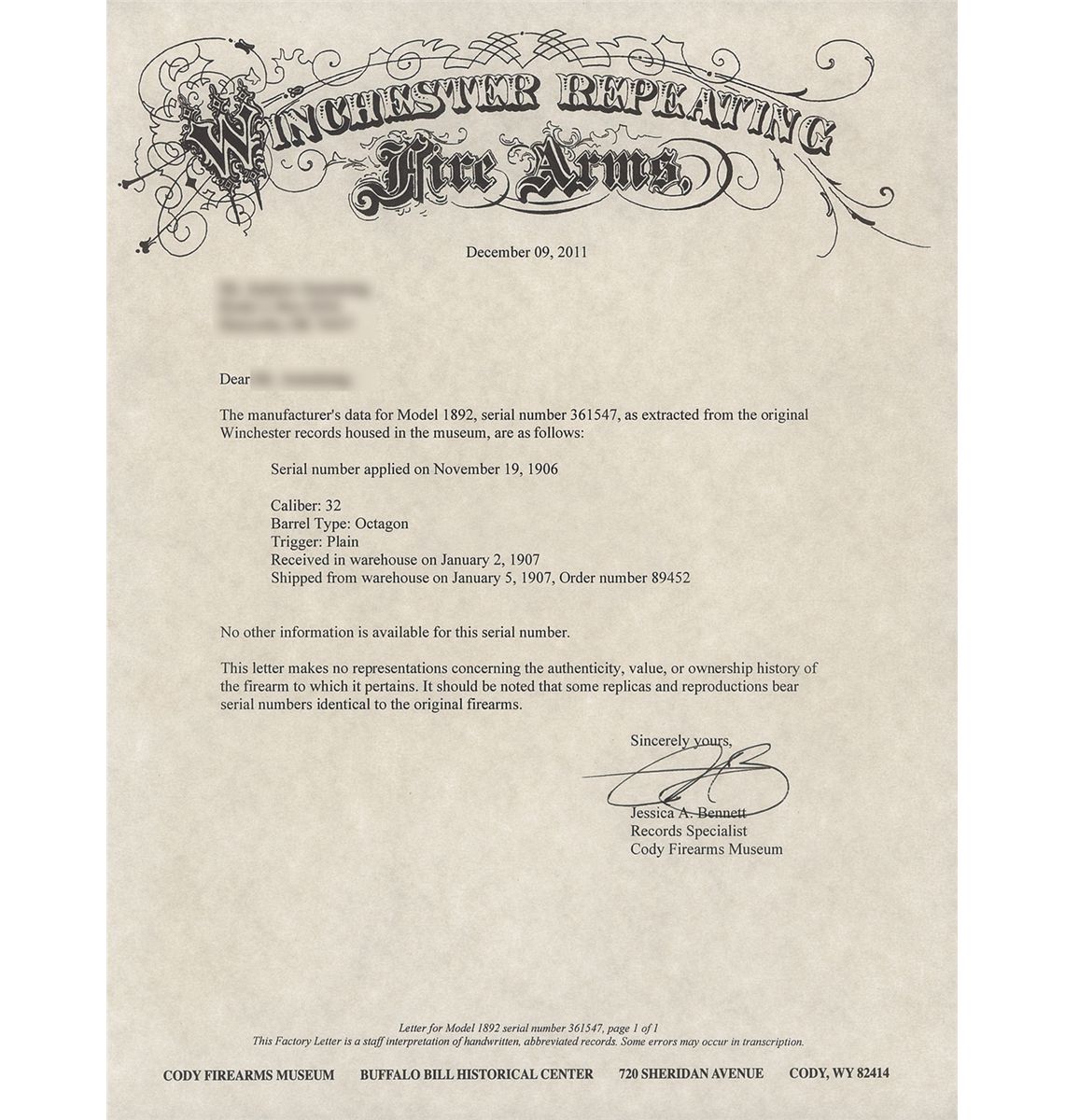 Letter confirms caliber, barrel type and plain trigger. Received in warehouse on Jan. 2, 1907 and shipped on Jan. 5, 1907.