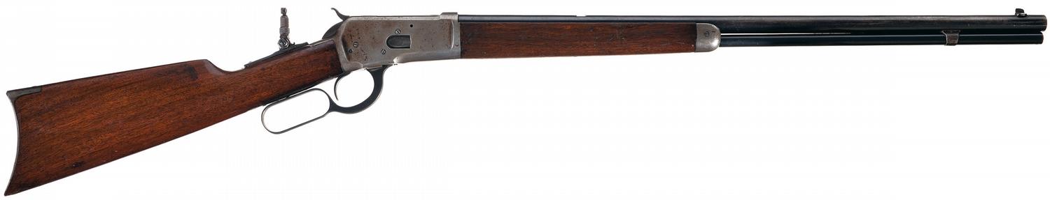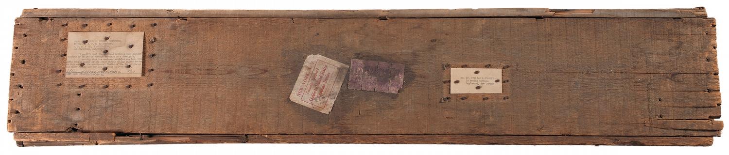 Manufactured in 1915. Blade front sight and rear sight absent (dovetail slot unfilled), with a full length magazine and Marble tang peep sight. Barrel has the two line address/patent marking on the left side along with "25-20 W.C.F." at the breech. Smooth forearm and straight grip stock with steel forend cap and crescent buttplate. Complete with a wooden shipping crate. The lid of the crate has a shipping label from Lt. Joseph L. Rummel, San Francisco, California, which is signed to certify that "enclosed articles were legally acquired" and articles were "gifts from a member of the Armed Forces of the United States". The forwarding shipping label gives the name Lt. William H. Stanley, Englewood, New Jersey. There is a New York Customs duties label and eight 50 cent U.S. stamps also on the lid.