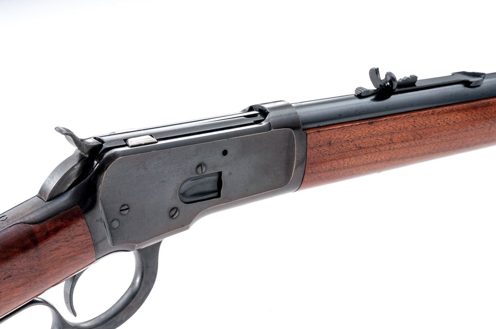 Winchester Model 1892 Lever Action Repeating Rifle, #503835, .44 W.C.F. (.44-40) CF cal., 24'' round barrel with standard buckhorn sights is marked with the maker's name, address and 1884 patent date on top, oval proof and ''44 W.C.F.'' at breech, has full-length mag tube below; receiver with top ejection and bottom operating lever is marked ''Model 1892/Winchester'' and Pat. Off. data on top tang; two-piece varnished walnut stocks, the forend retained by a steel nosecap, the buttstock with crescent buttplate.  Mfg'd. ca. 1909, originally with full-blued finish but for case hardened hammer and lever.  Condition is excellent retaining approx. 95% factory finish on barrel and mag tube and 60% on receiver.  Stocks are smooth and sound showing minor handling/use marks, lovely grain and color, and most original finish.  Action is crisp; bore is brilliant with fine rifling.  Est.:  $1,200-$1,800.  (C&R)