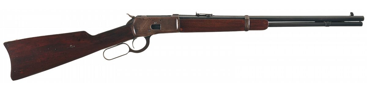 Manufactured in 1926. The left rear of the barrel is marked "-MODEL 92-WINCHESTER/-TRADE MARK- 25-20 W.C.F.-", the top of the barrel and receiver at the breech are marked with the Winchester oval proof, the upper tang is marked "MODEL 1892/WINCHESTER/TRADE MARK REG. IN U.S. PAT. OFF." and the serial number is marked on the bottom of the receiver. Pinned brass blade front sight and folding ladder rear carbine sight graduated to 200 yards, full length magazine, saddle ring and staple on the left rear of the receiver and mounted with a smooth walnut forearm and straight grip stock with a steel carbine buttplate.