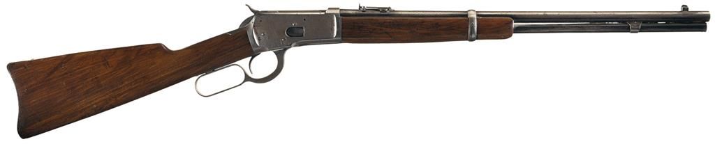 Manufactured in 1913. The left side of the barrel is marked with the two-line address/patent date ahead of the rear sight, "25-20 W.C.F." at the breech, the Winchester oval proof is marked on top of the barrel and receiver, the upper tang is marked with the three-line model, maker, trademark information and the serial number is marked on the underside of the receiver. Saddle ring and staple on the left side of the receiver, blue finish with casehardened hammer, lever and buttplate, and mounted with a smooth walnut stock and straight grip stock with a carbine buttplate.