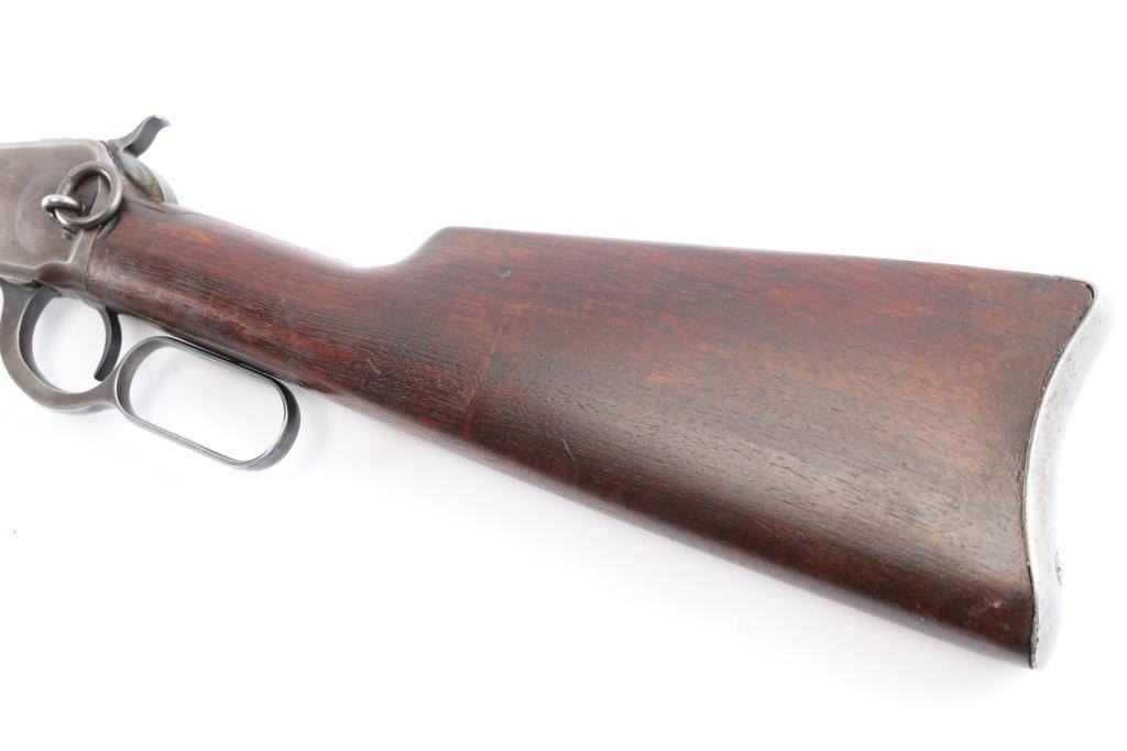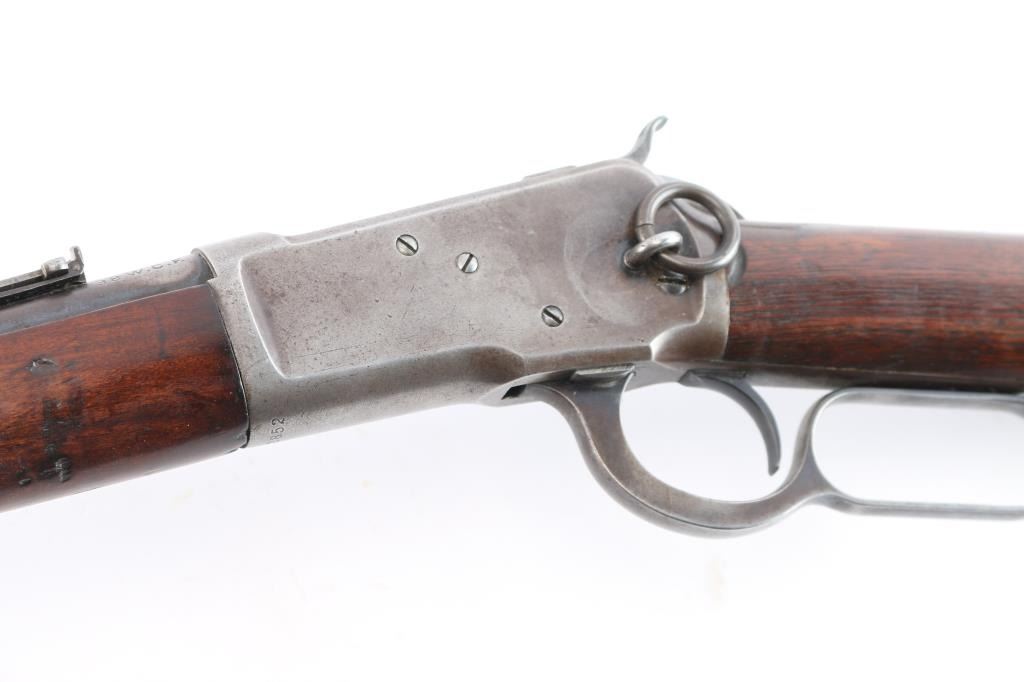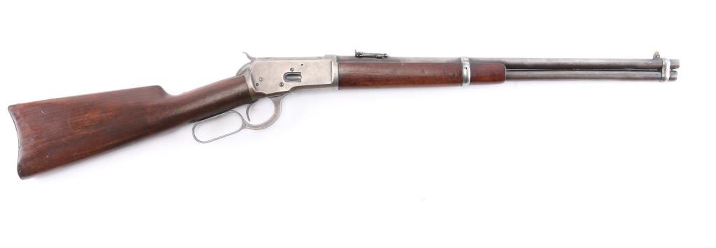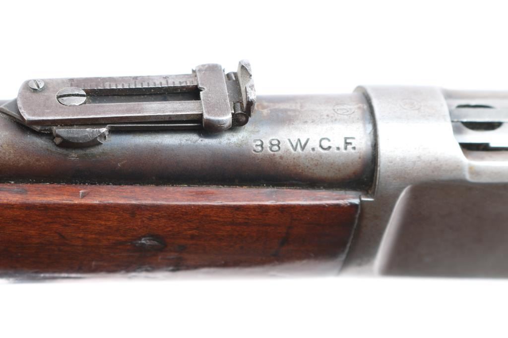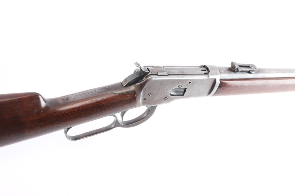 'Saddle Ring Carbine (SRC)' Lever action rifle manufactured circa 1915. Features saddle ring on left side of receiver, 20" round barrel, full length magazine tube, pinned brass blade front sight, (Blade is an early replacement), folding ladder rear sight, smooth walnut forend & straight wristed buttstock, steel carbine buttplate. Bore is very good/bright, strong rifling. Thin bluing on barrel/tube is about 20% with the rest a gray color from handling wear, some blue color in protected areas. Loading gate, trigger, hammer and lever show blue finish. Loading gate may be a later replacement, shows coverage of dark bluing. Wood is good condition with minor scratches/dents, shows an old varnish finish. Action is smooth, the Winchester markings are clear/readable.
