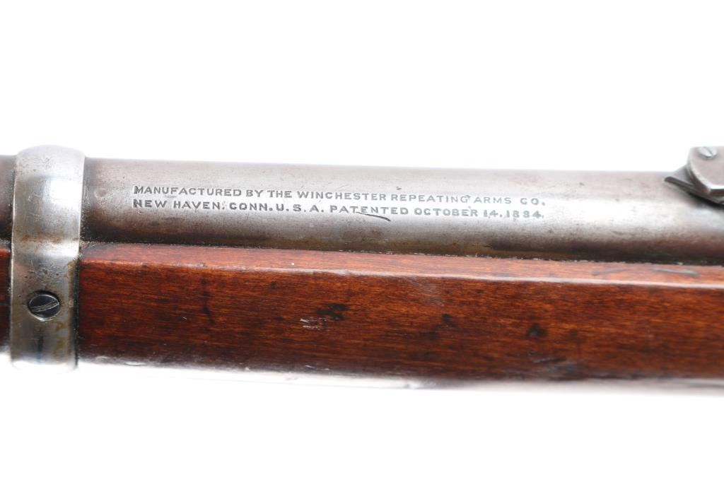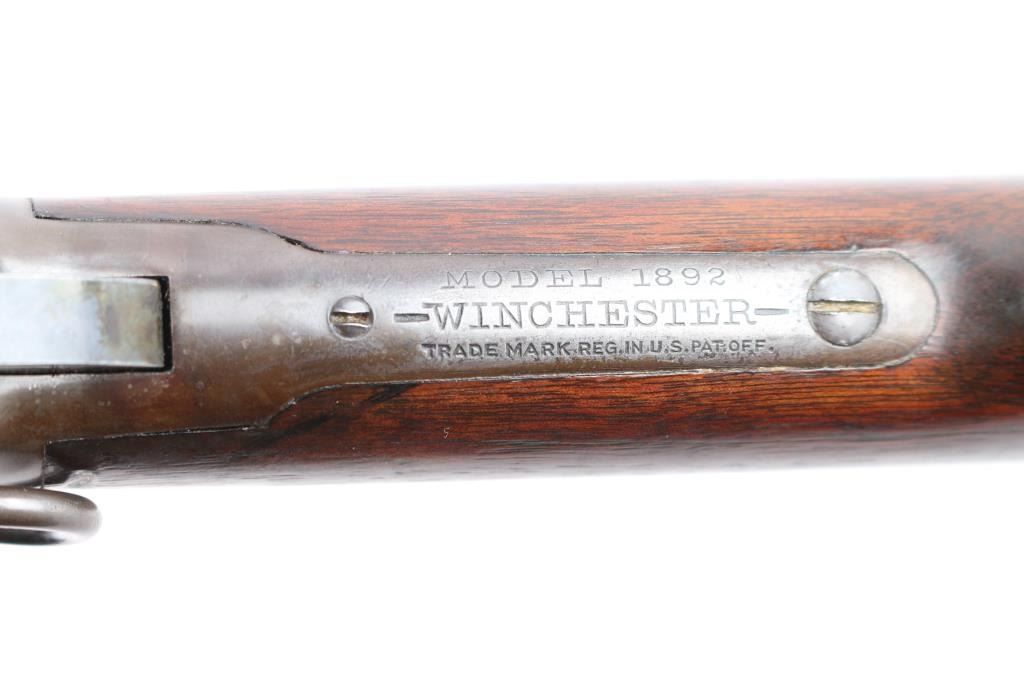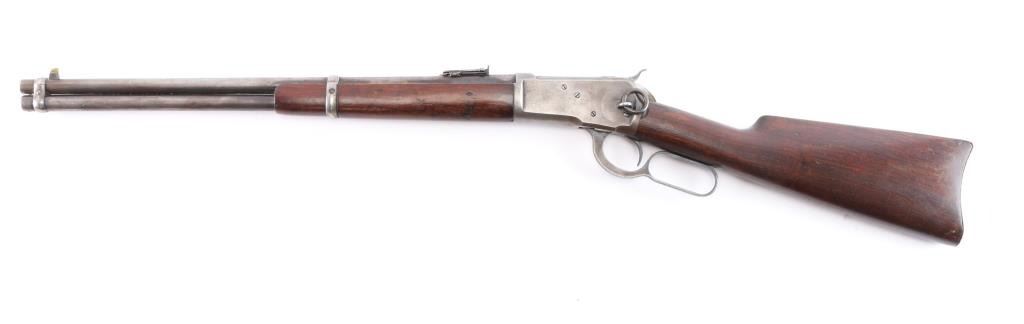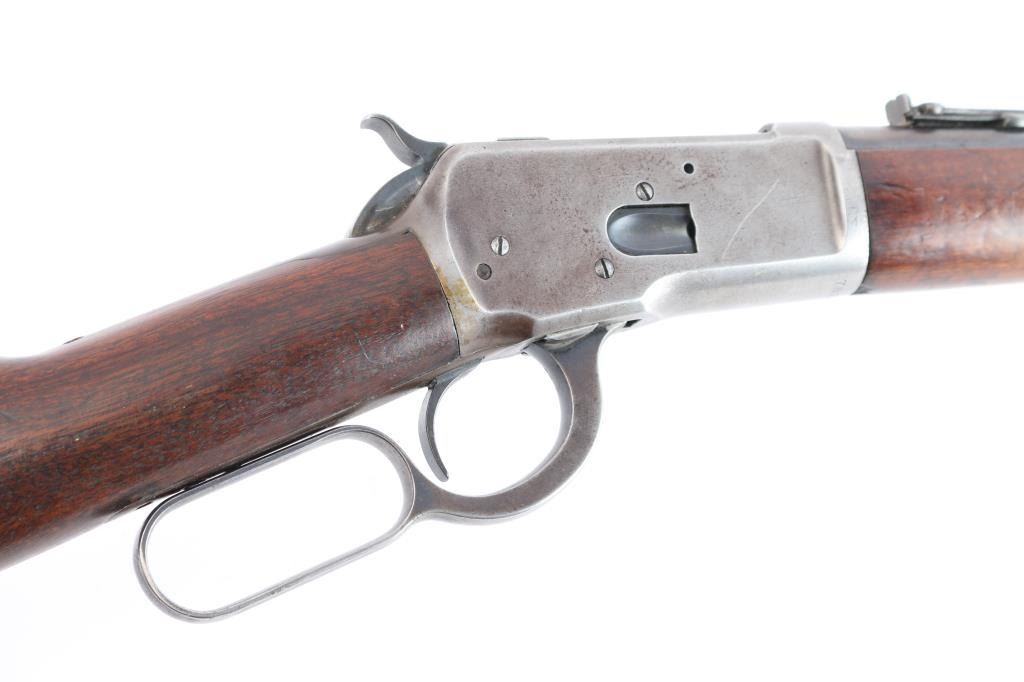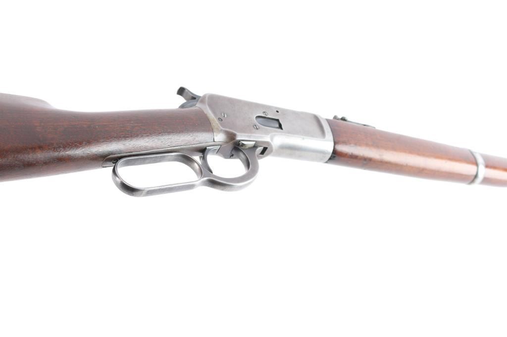 'Saddle Ring Carbine (SRC)' Lever action rifle manufactured circa 1915. Features saddle ring on left side of receiver, 20" round barrel, full length magazine tube, pinned brass blade front sight, (Blade is an early replacement), folding ladder rear sight, smooth walnut forend & straight wristed buttstock, steel carbine buttplate. Bore is very good/bright, strong rifling. Thin bluing on barrel/tube is about 20% with the rest a gray color from handling wear, some blue color in protected areas. Loading gate, trigger, hammer and lever show blue finish. Loading gate may be a later replacement, shows coverage of dark bluing. Wood is good condition with minor scratches/dents, shows an old varnish finish. Action is smooth, the Winchester markings are clear/readable.