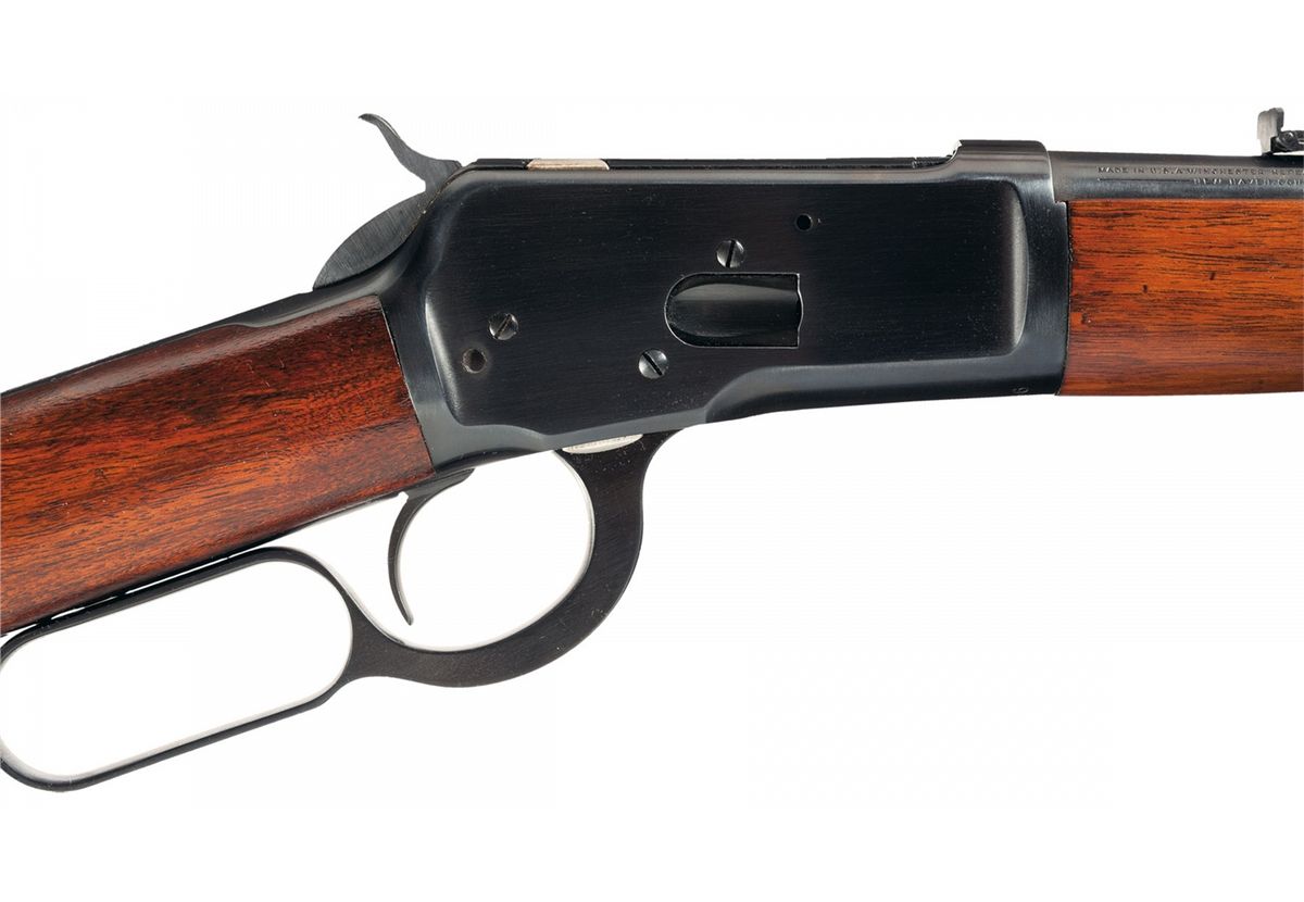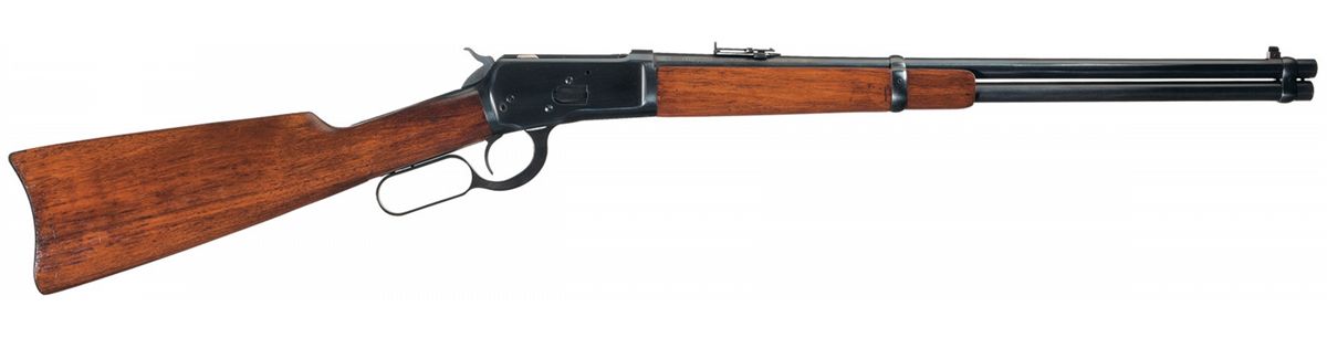 This is an example of a Winchester Model 1892 carbine that was manufactured in 1927 and subsequently refinished, possibly in the late 20th Century. This late production carbine has a full blue finish with oil finished walnut stock and forearm. The round barrel has a steel front sight blade mounted on a block behind the upper barrel band and a folding leaf rear sight graduated to 200 yards. A staple-mounted saddle ring is located on the left side of the receiver. The stock has a carbine style buttplate. The left side of the barrel is roll-stamped with the two-line legend "-MODEL 92- WINCHESTER- 44 W.C.F.-/-TRADE MARK-" between the rear sight and the receiver. Oval Winchester "W/P" proofmarks are stamped on the top of the barrel and the receiver. The serial number, "992356" is stamped across the bottom of the receiver just behind the junction with the forearm. The upper receiver tang is roll-stamped "WINCHESTER/TRADE MARK/MADE IN U.S.A.".