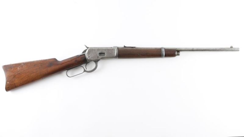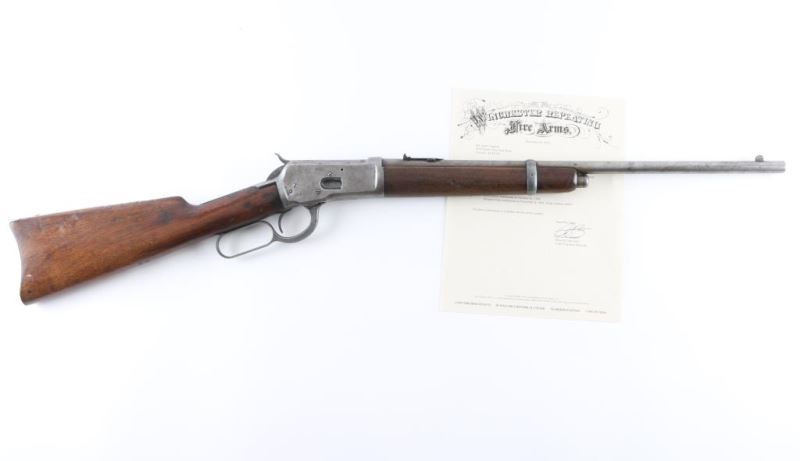 SN: 269426 'Stinger' lever action rifle manufactured circa 1904. Features 20" barrel, half length ("button") magazine, pinned blade front sight, dovetail rear sight with one standing & one folding leaf, saddle ring, carbine butt, smooth walnut forend & straight wrist stock. Bore is fair condition, pitted and slightly dark, with good rifling. Metal surfaces are dull gray bare metal with spots of smooth dark patina. tiny pits throughout. Wood is fair condition, lightly sanded and varnished, eroded at tang, many dents & dings. Butt has seven cuts to top and two to bottom, appear to be purposefully cut notches. Markings are mostly sharp, including Wasp image and "THE STINGER" on barrel. Two line barrel address is a bit shallow. Included factory letter verifies this rifle as a "Stinger" model, shipped as a 44 cal with half magazine. These rifles were shipped to Perry Bros, Brisbane Australia, with the special markings applied by the factory. Condition is NRA Good+ *** C&R Firearm *** [From the Jim Sigmon Collection]