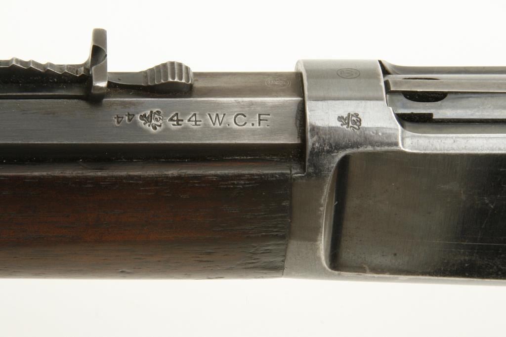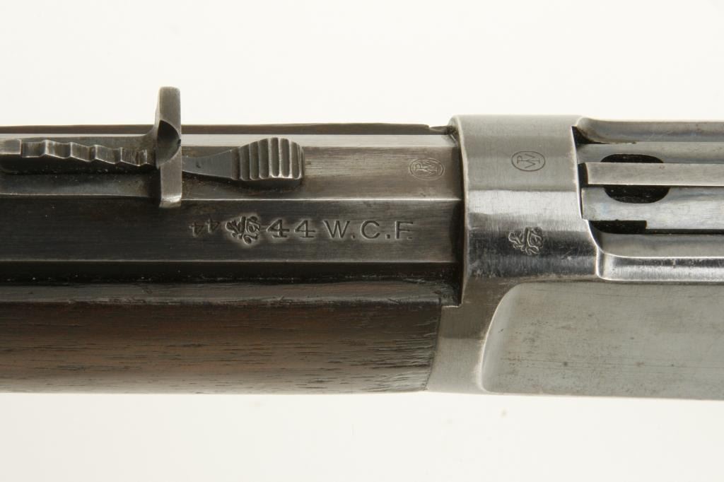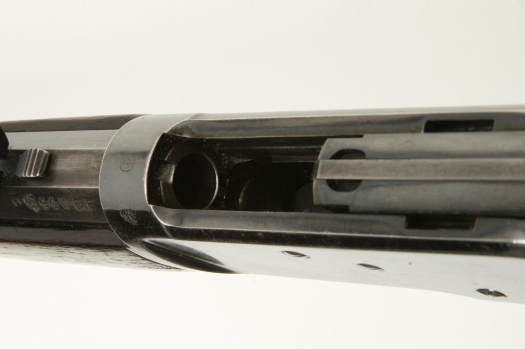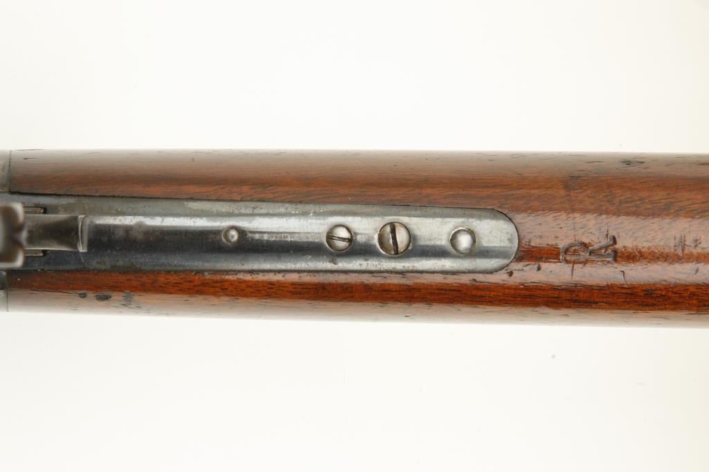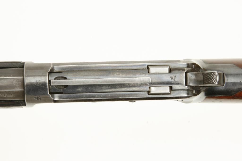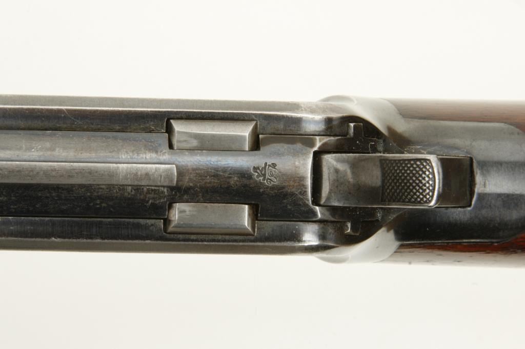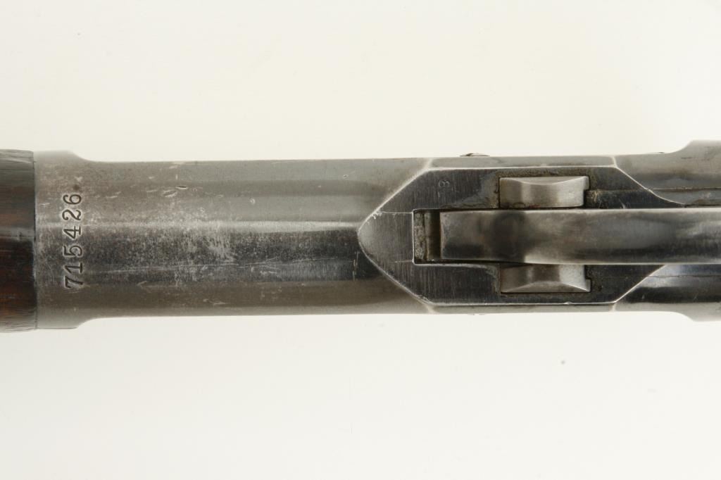 caliber with 20” octagon barrel, full magazine, crescent butt, serial number 715426. The rifle remains in very good plus to near fine original condition showing 80% to 90% bright original blue drifting at the high points and edges. The markings are sharp and crisp. The stocks are very good plus to near fine with excellent wood to metal fit. A few minor dings, mars and slight scratches with just minor normal aging. The action is crisp and the bore is bright and near excellent. The rifle shows small standing lion proofs on the frame, barrel and bolt. (C&R) Est.: $6000-$12,000