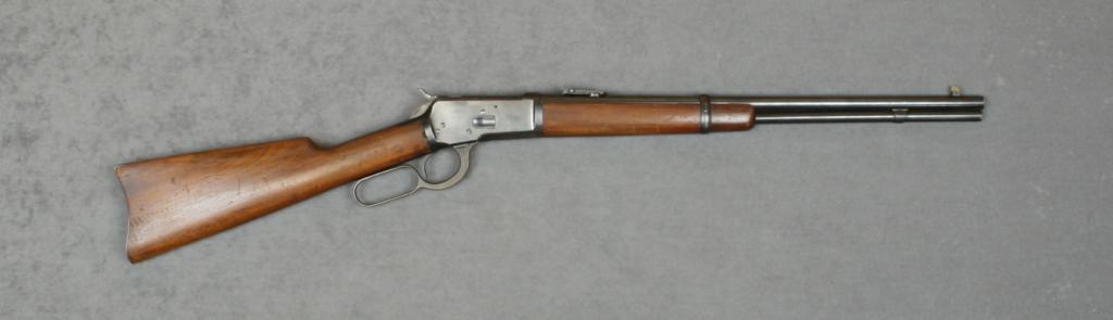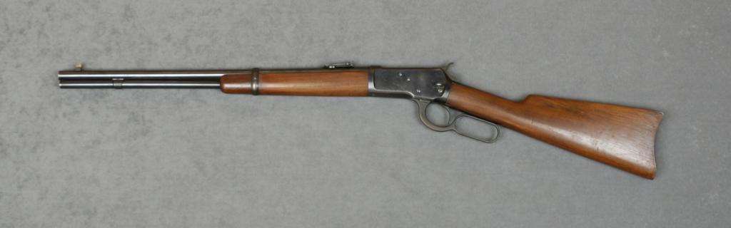 Winchester Model 1892 lever action SRC (post present, ring missing), .32 WCF cal., 20” round barrel, blue finish, wood stocks, #352218. This gun is in overall excellent condition showing approx. 90% original bluefinish, fine bore, crisp action and markings, very good wood stocks with scattered nicks, mars and scratches from storage. Est.: $1,500-$3,000.