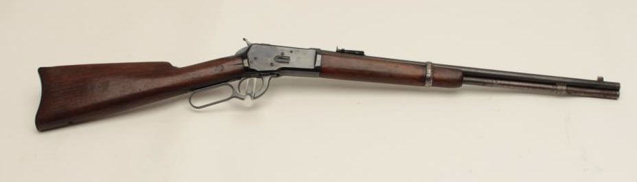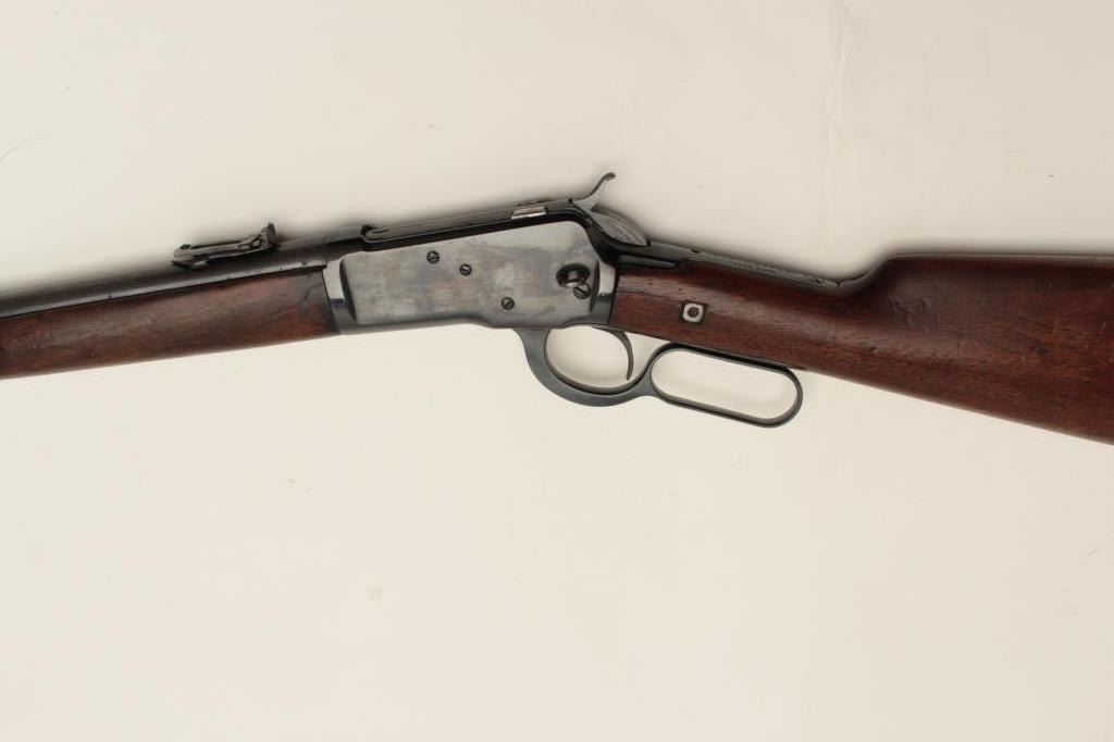 Winchester Model 1892 lever action carbine with added old saddle ring, .32 W.C.F. caliber, 20” barrel, blued finish, wood stocks, S/N 341942, in overall fair to good condition with a good bore, action andmarkings, wood butt stock shows an old repair at the wrist and a small repaired old crack at the comb; receiver and lever may have been re-finished during life of the carbine. (C&R/No PPT). Est.: $400-$800.