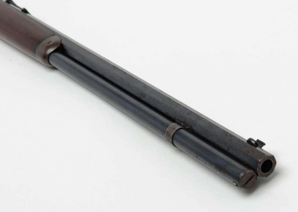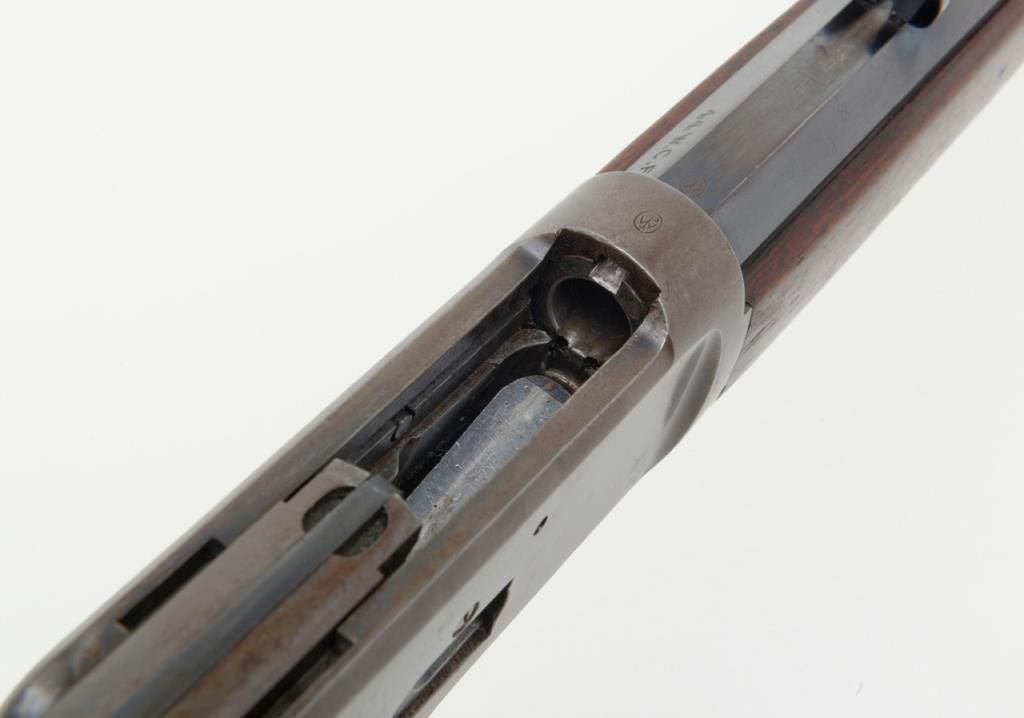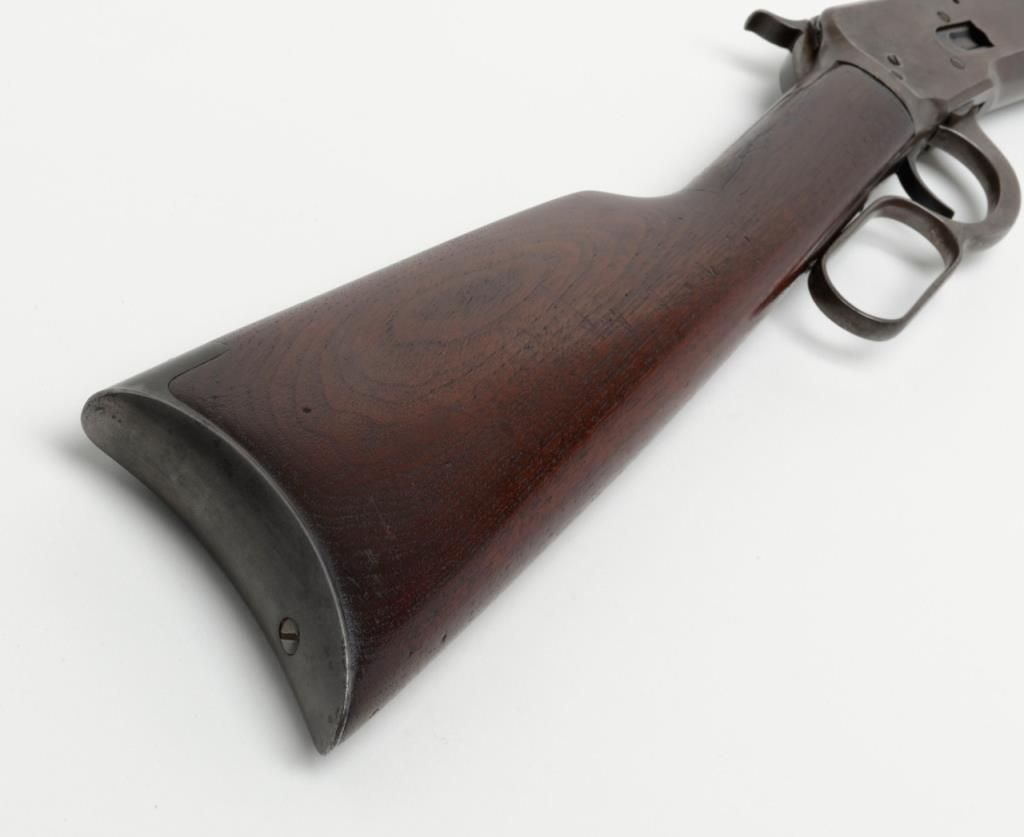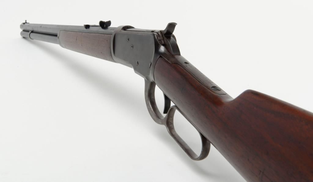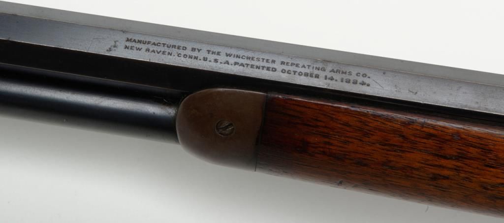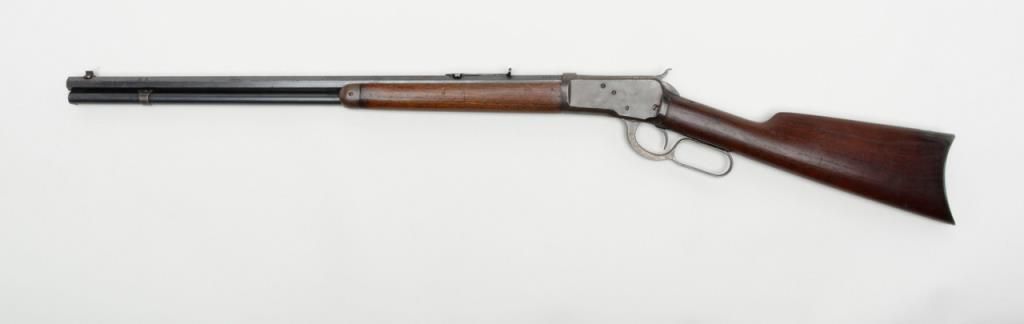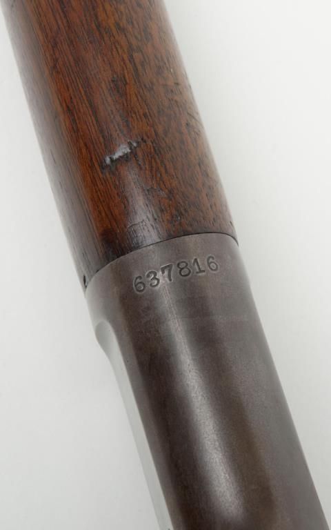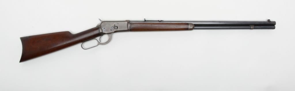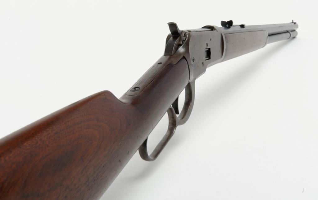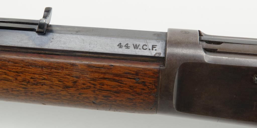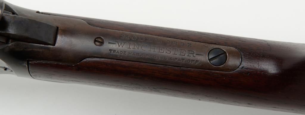Winchester Model 1892 lever action rifle, desirable .44 W.C.F. cal., 24” octagon barrel, blue finish, wood stocks, #637816 in overall very good condition showing considerable original blue finish on barrel and loading tube with somescattered spots of erosion on the barrel, brown patina on the receiver, bright bore, crisp action, sharp markings and very good wood. (C&R/PPT). Est.: $1,200-$2,400