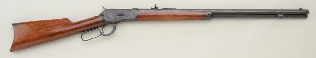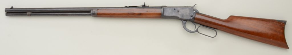 Winchester Model 1892 lever action rifle, full magazine, .25-20 W.C.F. cal., 24” round barrel, blue finish, wood stocks, #659561. This gun is in overall good + condition showing considerable muted blue finish, goodbore, crisp action, good markings, overall good wood showing checkering to an old re-finish and some scattered nicks and mars from carry and storage; several scattered dents to loading tube. Est.: $600-$1,200.