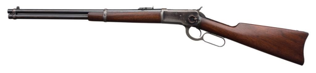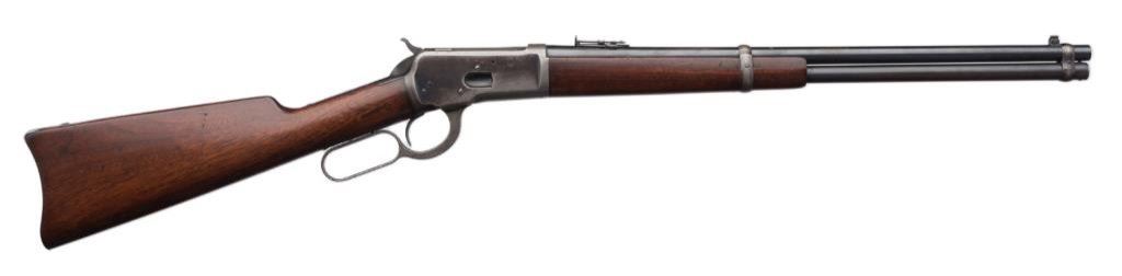 Winchester Model 1892 lever action saddle ring carbine, .38 W.C.F. caliber, 20” barrel, S/N 161154, blued finish, wood stocks in overall very good to near fine condition showing the majority of its original finish on the barrel and loading tube and considerable original blue on the receiver; crisp action, sharp markings, fine bore and very good to near fine wood. Est.: $2,500-$5,000.