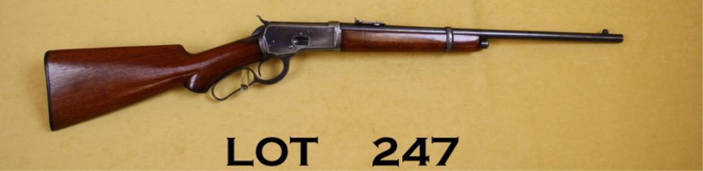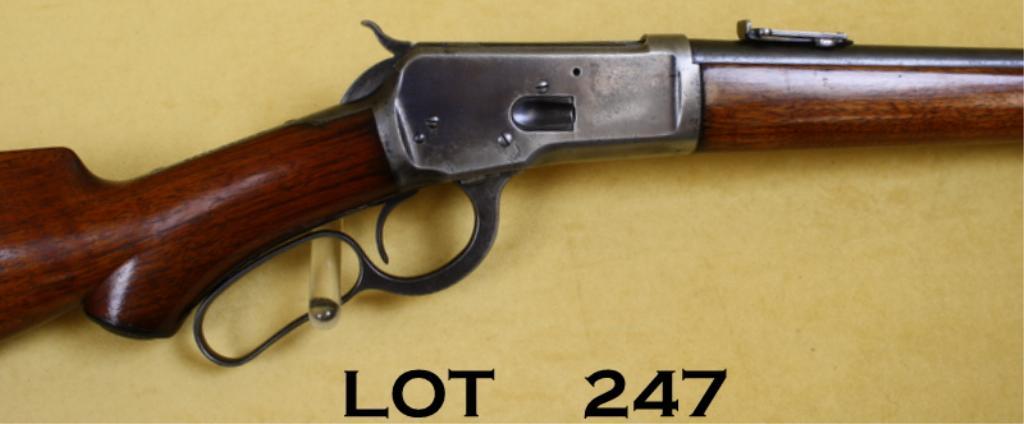 Winchester Model 1892 lever action special order SRC, .38 WCF cal., 20” round nickel steel barrel, half magazine, pistol grip wood butt stock, shotgun butt, #408306. This gun is in overall good to very good condition showing approx. 85% original muted blue finish to the barrel and approx. 20% original blue on the receiver with some scattered blood pitting spots, good to very good bore, crisp action, good markings, correct Winchester hard rubber pistol grip cap and checkered hard rubber butt pad; wood stocks are overall very good with nice graining and some scattered slight mars from storage. Est.: $3,000-$5,000.