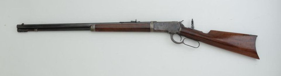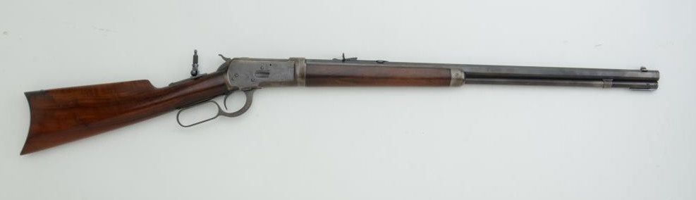 Winchester Model 1892 lever action takedown rifle, .25-20 W.C.F. cal., 24” octagon barrel, blue finish, wood stocks, adjustable tang sight, #163613 in overall very good condition showing considerable muted original blue finish, fine bore, crisp action, very good markings and very good wood stocks; accompanied by a box of Winchester ammunition. Est.: $1,400-$2,800.