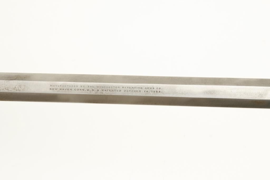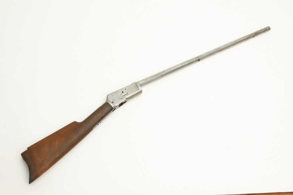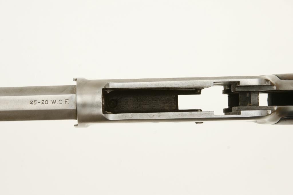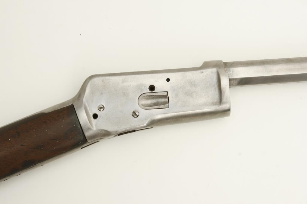 #2222. The rifle is incomplete with just the barrel, receiver and butt stock. The 24” octagon barrel is in the white with the sights removed and some light surface pitting noted. The receiver has also been polished white with light surface rust evident. The butt stock is missing the butt plate and has been lightly sanded. The bore is good, showing light pitting and wear. A nice parts rifle in need to TLC. Est.: $100-$200.